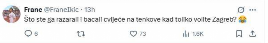 "Izdrži, Zagrebe, danas, znamo da TO nisi ti. Pusa iz Beograda, ni ONI nismo mi", aludirajući da je neki drugi, imaginarni Zagreb podjednako "urban" kao ovaj blokaderski u Srbiji, pa im je neko drugi nametnuo njihovog pevača, naredio valjda državi da mu organizuje koncert, a mučene "urbane" Zagrepčane naterao u velikom broju ne samo da dođu već i da prethodno kupe karte za koncert.