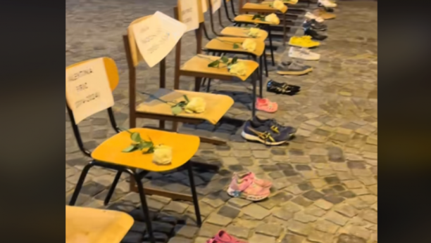 Oni su sinoć poređali stolice na kojima su bili zalepljeni papiri sa imenima nastradalih u padu nadstrešnice u Novom Sadu. Takođe su na stolicama, simbolično, stajale ruže, a ispred njih - pretpostavlja se, obuća nastradalih.