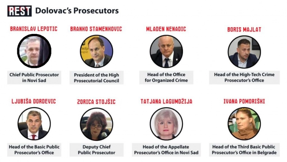 Ključne figure uključuju: Branislava Lepotića, Ivanu Pomoriški (šef Trećeg osnovnog javnog tužilaštva u Beogradu, koje pokriva jedan od najosetljivijih delova prestonice), Borisa Majlata (šef Tužilaštva za visokotehnološki kriminal, strateški važna pozicija za nadzor digitalnog prostora, komunikacije i elektronskog nadzora), Branka Stamenkovića (predsednik Visokog tužilačkog saveta, tela zaduženog za kadrovska pitanja i disciplinske postupke; njegova uloga je ključna u očuvanju mreže), Ljubišu Đorđevića (šef Osnovnog javnog tužilaštva, angažovan u politički osetljivim predmetima), Mladena Nenadića (šef Tužilaštva za organizovani kriminal, koje ima kapacitet da kroz istrage utiče na političke procese), kao i Zoricu Stojšić, Tanju Lagumdžiju i Radivoja Kaćanskog.