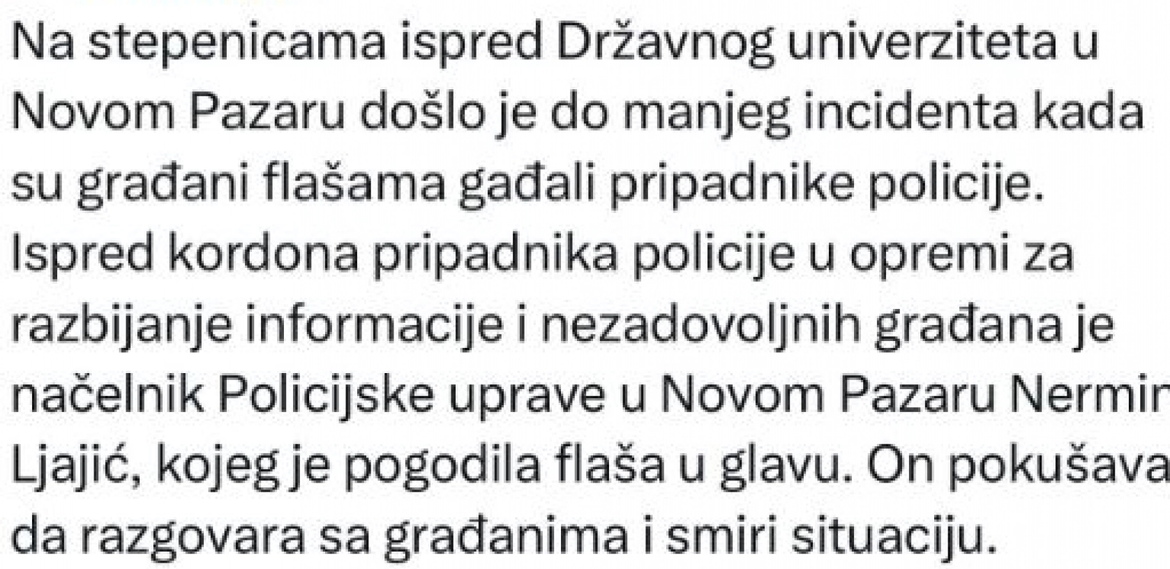 Takođe, navode i da je je načelnika Policijske uprave u Novom Pazaru Nermira Ljajića flaša pogodila u glavu.