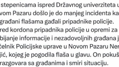 "Na stepenicama ispred Državnog univerziteta u Novom Pazaru došlo je do manjeg incidenta kada su građani flašama gađali pripadnike policije," piše ovo glasilo opozicije.