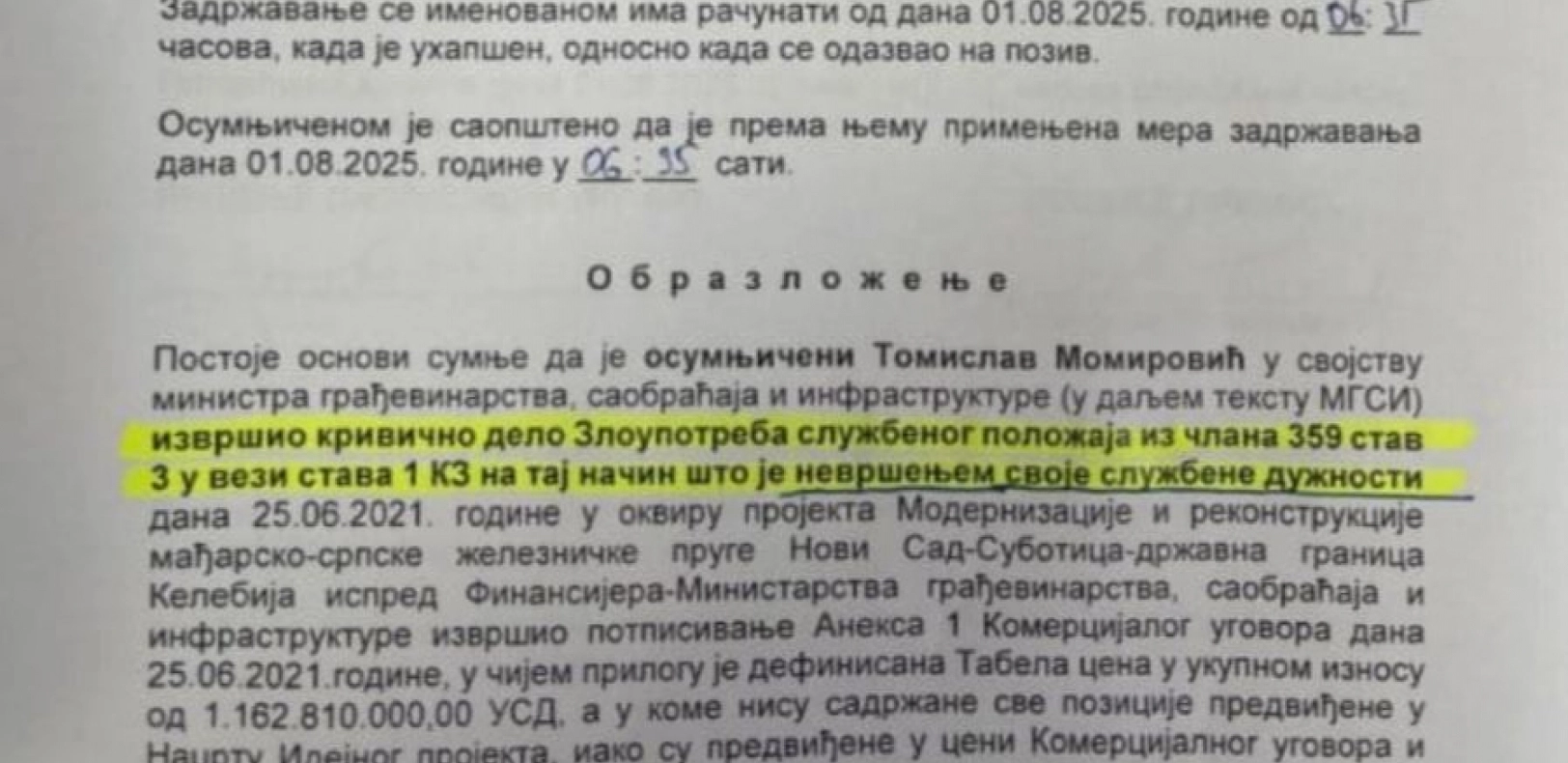 Prema obrazloženju rešenja kojim se Momiroviću određuje pritvor do 48 sati stoji da se Momiroviću na teret stavlja krivično delo "Zloupotreba službenog položaja", odnosno, kako su naveli, "nevršenja službene dužnosti."