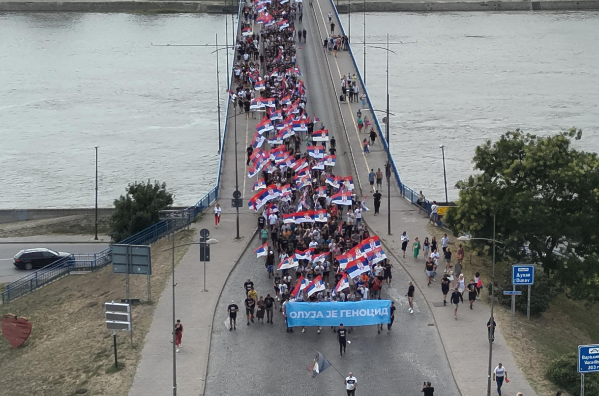 Veliki broj građana stigao je u Sremske Karlovce noseći zastave Srbije, a na čelu kolone je bio transparent "Oluja je genocid".