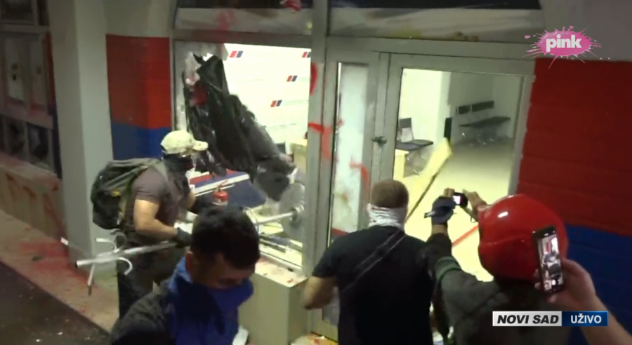 U Novom Sadu grupa od 200 blokadera siledžija sa maskama i maramama preko lica izazvala je haos u prostorijama Srpske napredne stranke u u Bulevaru oslobođenja, u Kosovskoj i Stražilovačkoj ulici.