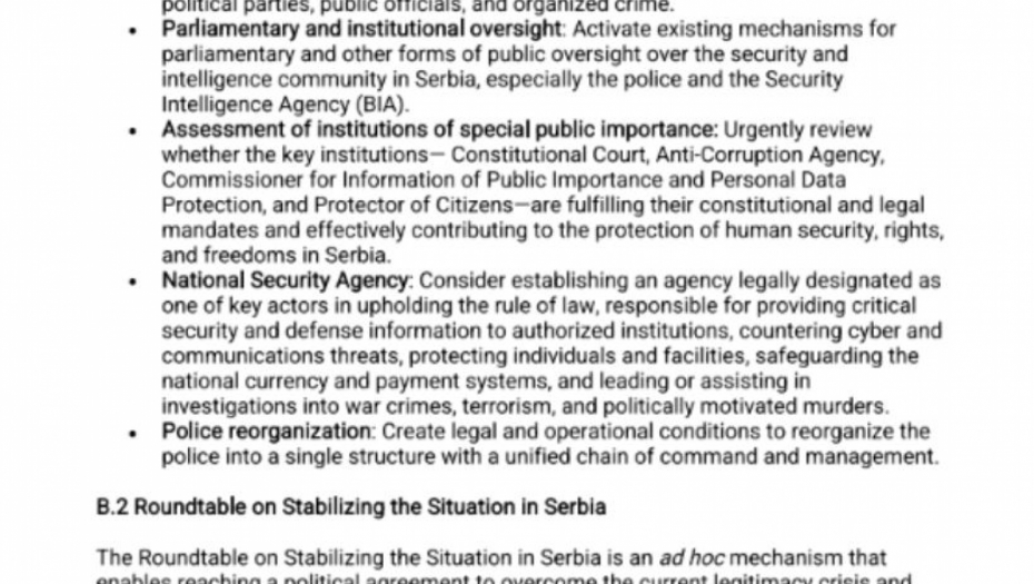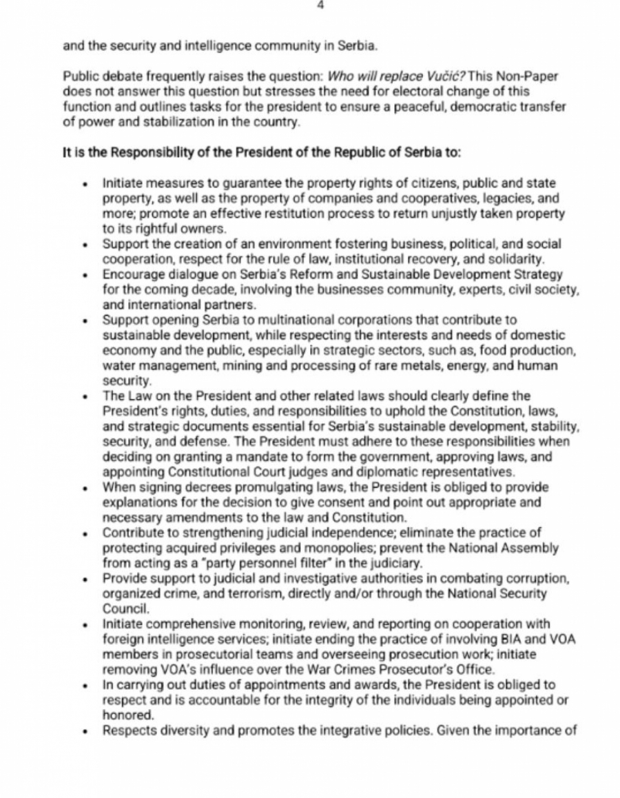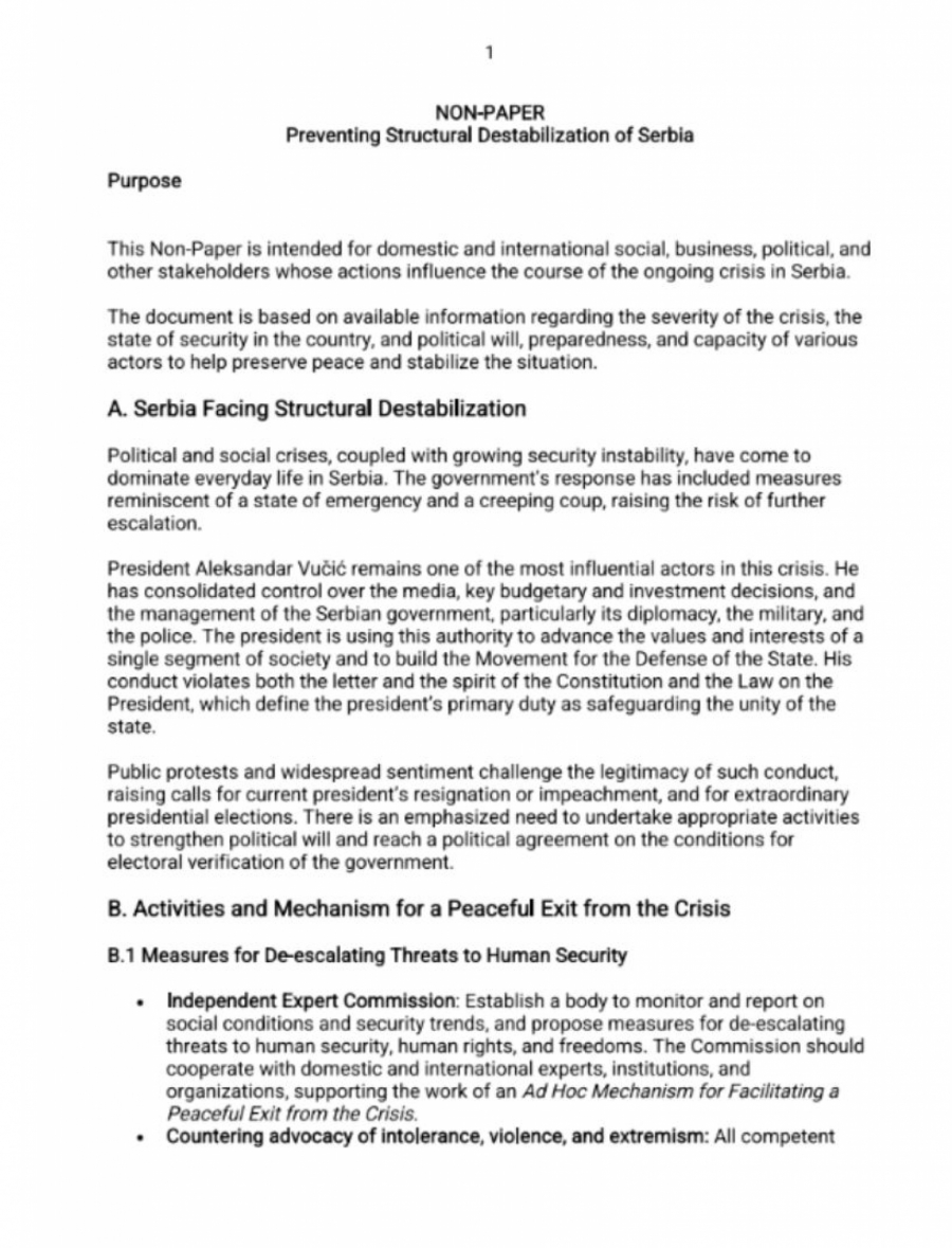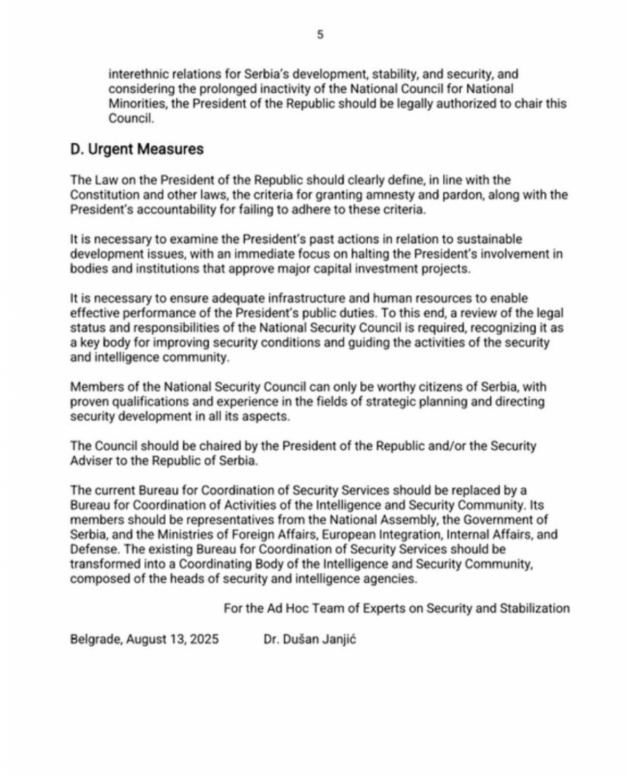 "Zbog ozbiljnih bezbednosnih izazova, poseban fokus je na ulozi predsednika, Saveta za nacionalnu bezbednost i bezbednosno-obaveštajnih službi. Ne pitanje "ko će zameniti Vučića", već kako omogućiti demokratsku smenu i miran prenos vlasti", piše u non pejperu koji je Dušan Janjić poslao 13. avgusta, a koji je kako je naveo - namenjen domaćim i međunarodnim društvenim, poslovnim, političkim i drugim akterima čije aktivnosti utiču na tok aktuelne krize u Srbiji.