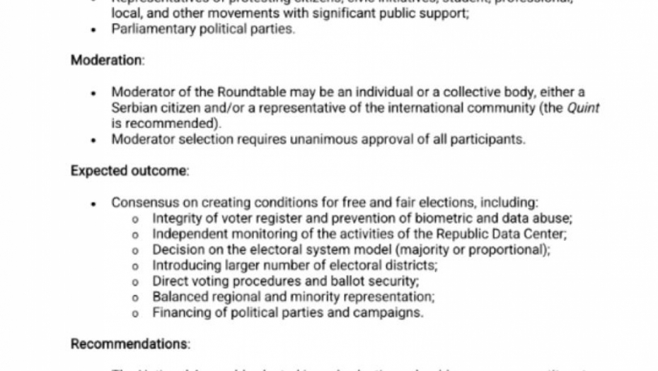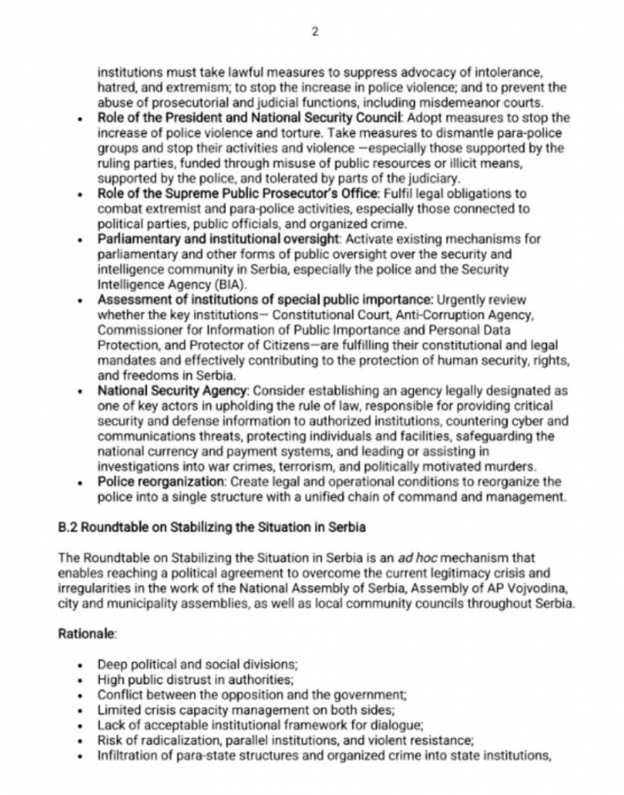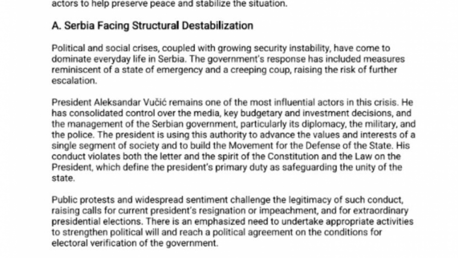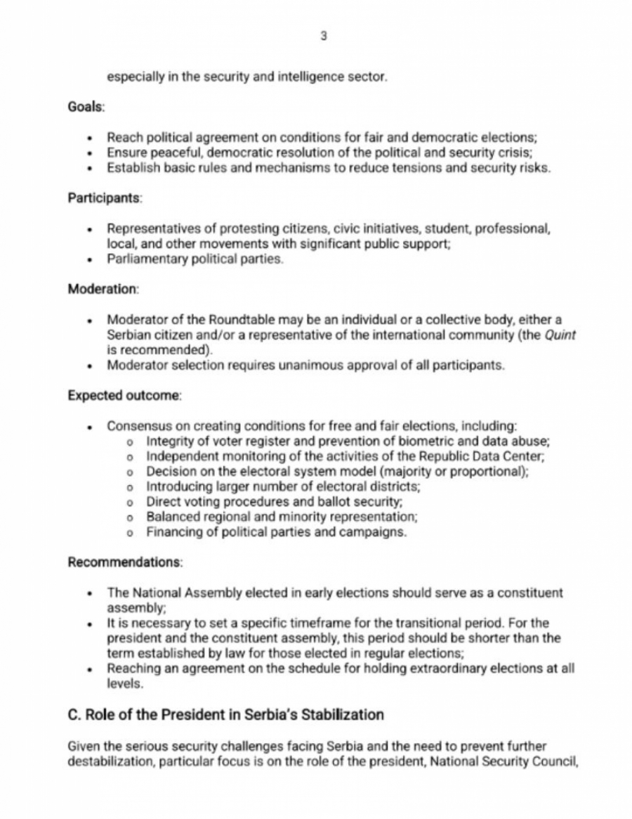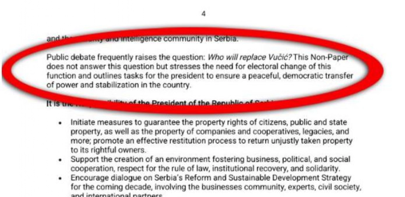 "Zbog ozbiljnih bezbednosnih izazova, poseban fokus je na ulozi predsednika, Saveta za nacionalnu bezbednost i bezbednosno-obaveštajnih službi. Ne pitanje "ko će zameniti Vučića", već kako omogućiti demokratsku smenu i miran prenos vlasti", piše u non pejperu koji je Dušan Janjić poslao 13. avgusta, a koji je kako je naveo - namenjen domaćim i međunarodnim društvenim, poslovnim, političkim i drugim akterima čije aktivnosti utiču na tok aktuelne krize u Srbiji.