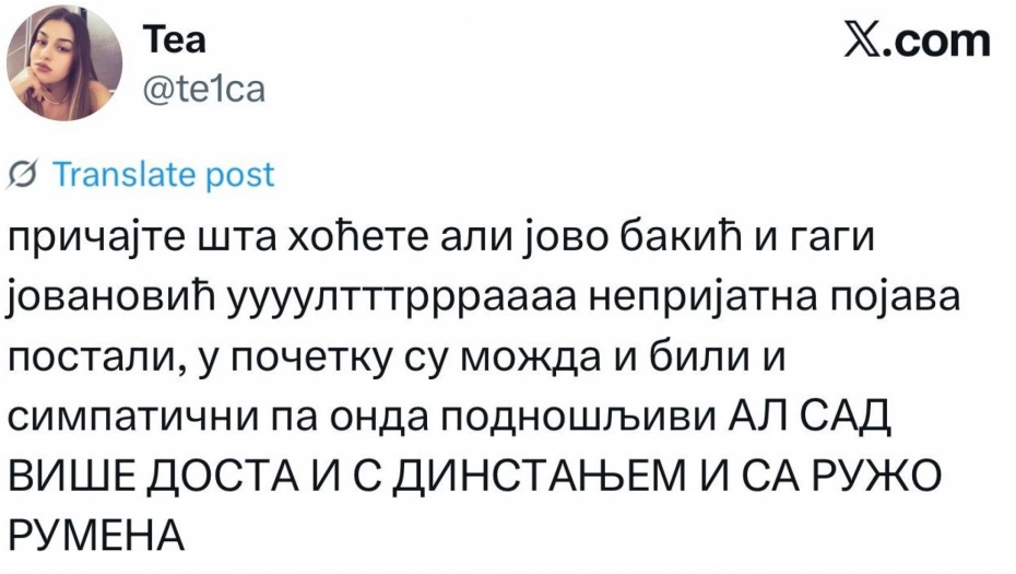 "Pričajte šta hoćete, ali Jovo Bakić i Gagi Jovanović ultraneprijatna pojava postali. U početku su možda i bili simpatični pa onda podnošljivi, ali sad više dosta i s dinstanjem i sa ružo rumena".