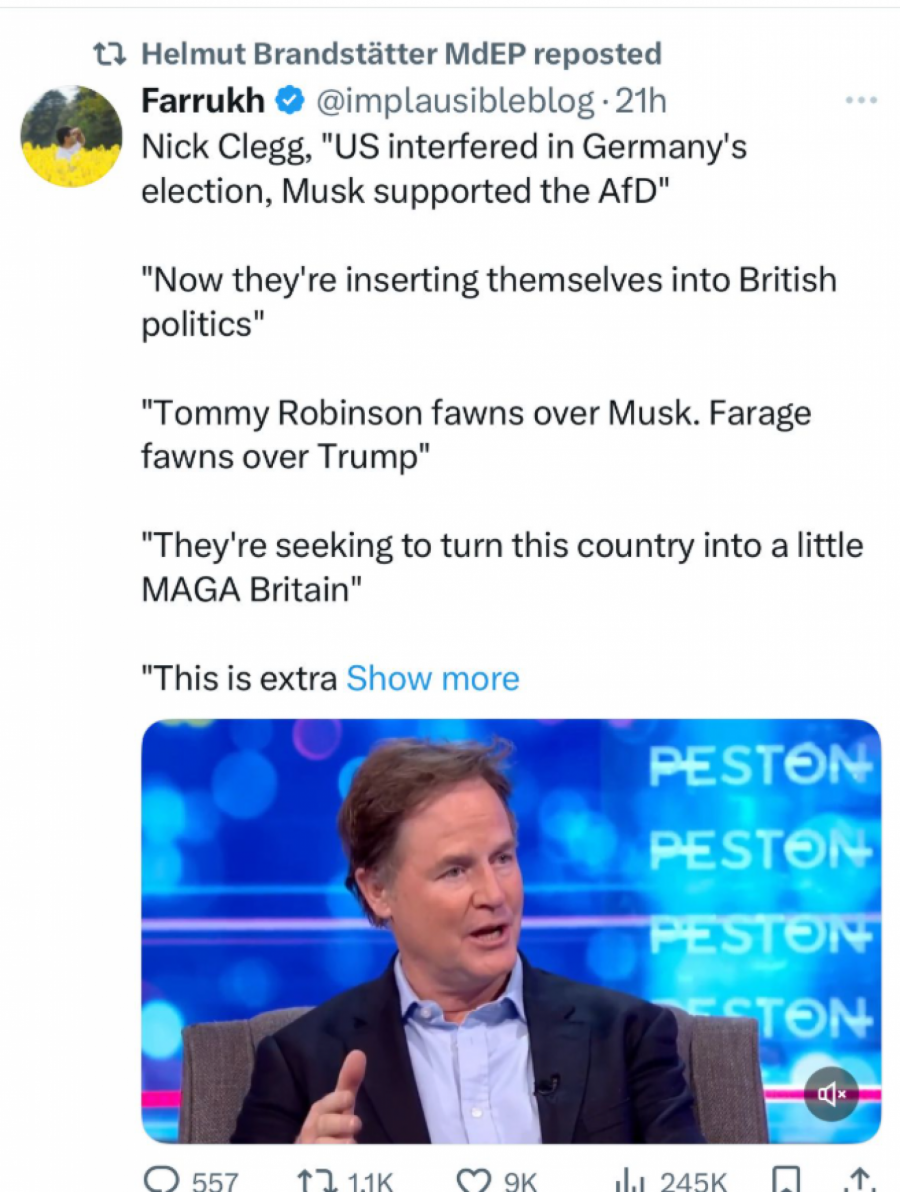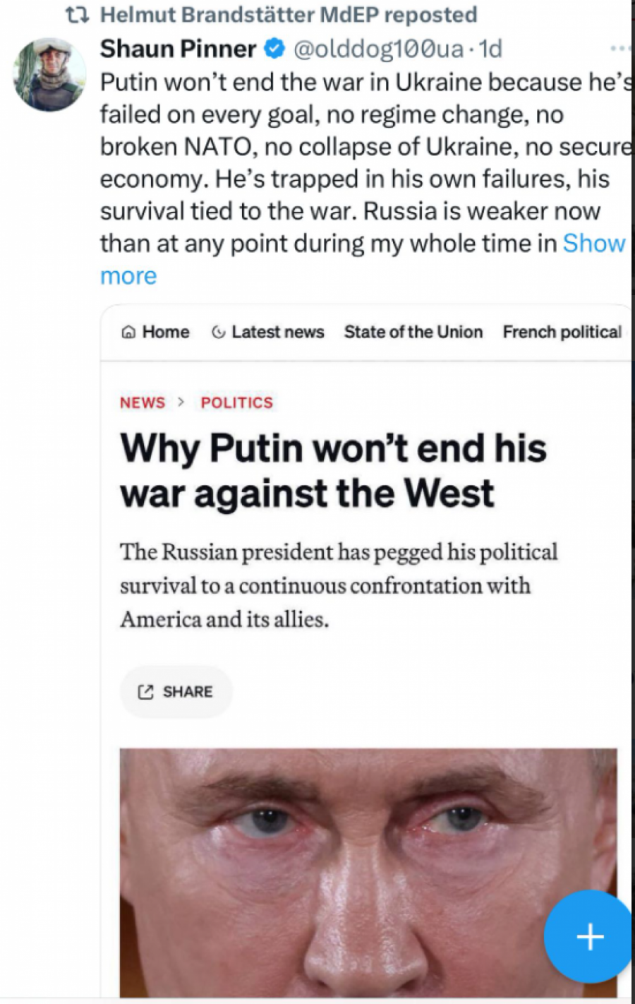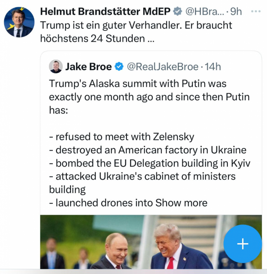 Na mreži X Brandšteter, danima ne silazi sa propagandnog bicikla, Putin je neprijatelj Evrope, Tramp pretnja demokratiji, AfD fašisti, a Srbija problem koji treba „rešiti“. Republika Srpska za njega ne postoji. Kosovo je, naravno, nezavisna država. I sve to neumorno dele i prenose „nezavisni“ N1, Nova S, Danas i slični glasnici stranih interesa.