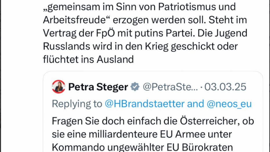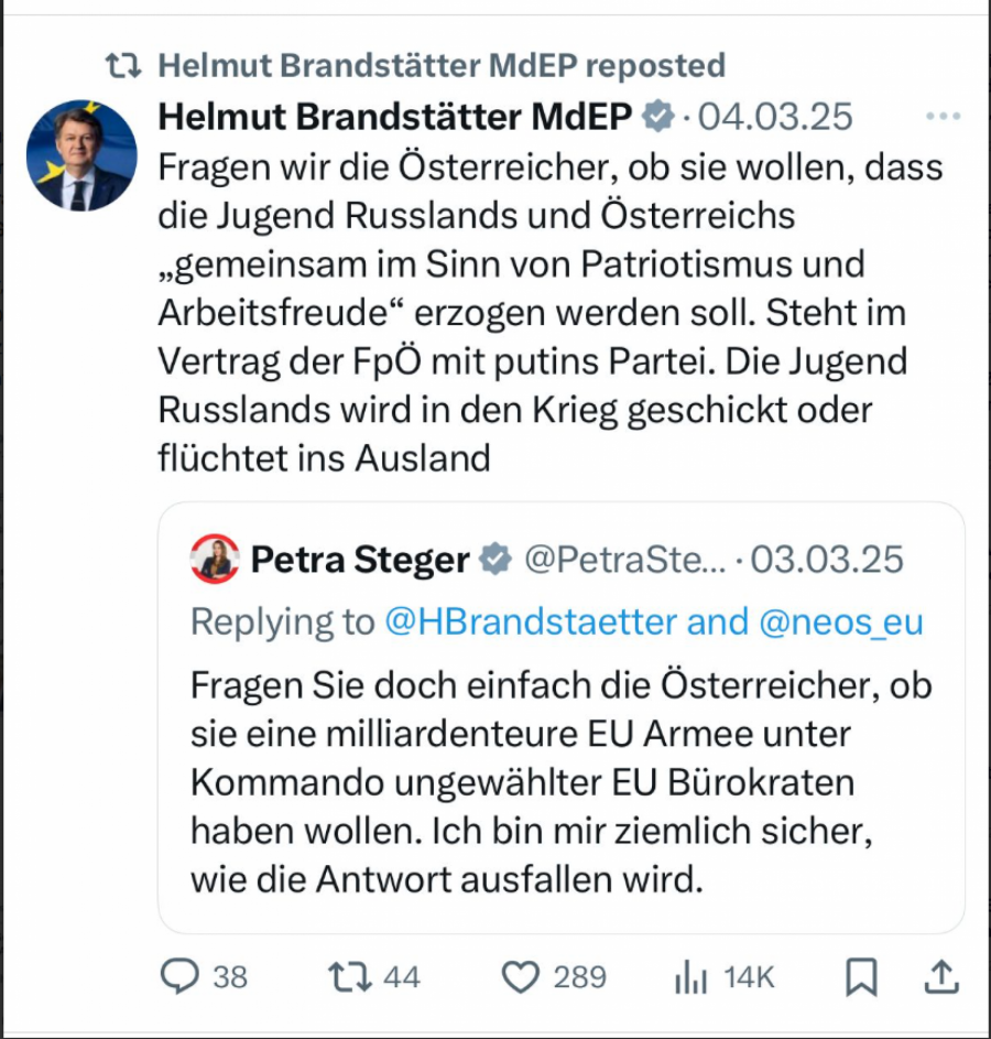 NEOS, čiji je Brandšteter perjanik, politički sarađuje isključivo sa bošnjačkim i albanskim predstavnicima sa Balkana. Saradnju sa Srbijom ne žele, osim ako je na kolenima. Ta stranka sistemski razara temelje austrijskog društva, zalažući se za masovnu migraciju, islamizaciju i pretvaranje Evrope u prostor bez identiteta. To je model koji bi da izvezu u Srbiju.