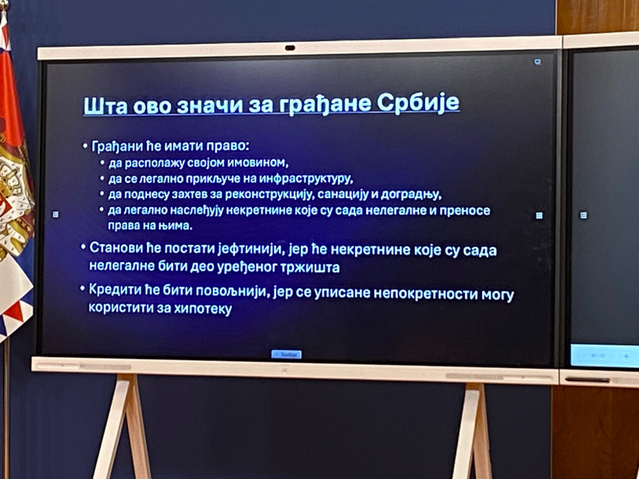 - Vi znate da u našoj zemlji postoji 4,8 miliona objekata koji se koriste bez upisa prava ili upotrebne dozvole. Ti ljudi ne mogu objekte da stave pod hipoteku, da koriste kredite, da ih stave u pravni promet, da raspolažu tom imovinom. Istovremeno se i najčešće ne plaća porez na imovinu na takve objekte, i imamo jednu nepoznatu situaciju u kojoj ljudi nemaju izvesnu budućnost - rekao je on.