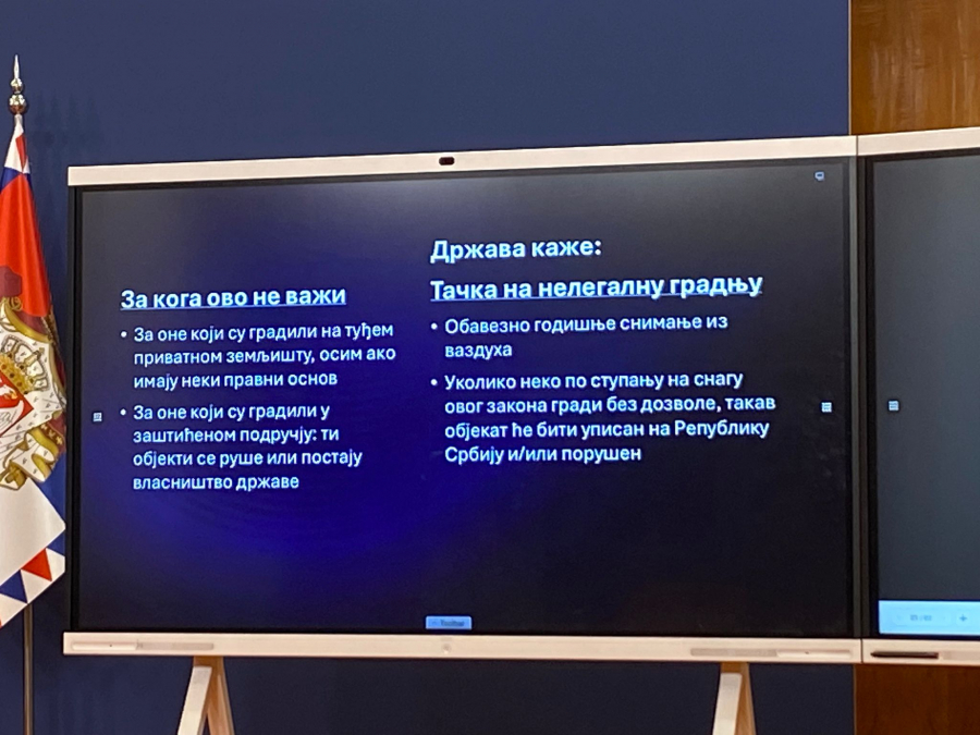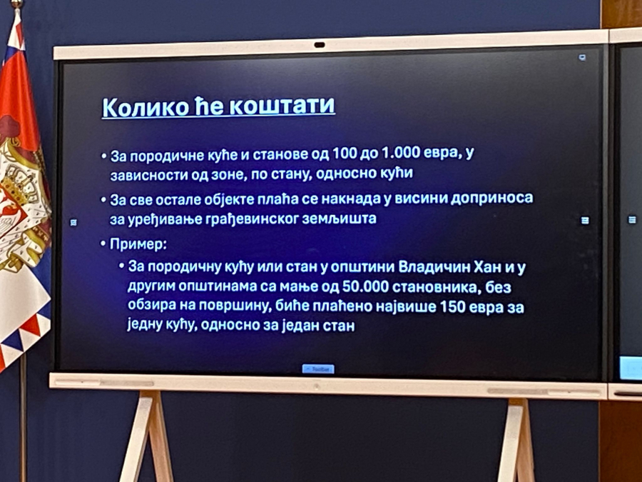 - To je neverovatno za građane. Naša ideja je da prostom prijavom u digitalnoj formi evidentiramo sve objekte. Elektronsku prijavu pošaljete samo prijavu, biće utvrđeno do nove godine, pošaljete u opštinu, jedan običan papir. I vi do nove godine u roku od 60 dana imate svoj legalan objekat, u potpunosti. Kompletan objekat platite 100 evra legalizaciju. A najskuplje će biti stan na Terazijama 200 kvadrata, za to platite 1.000 evra. To je najskuplje. I stan postane legalan - rekao je predsednik.