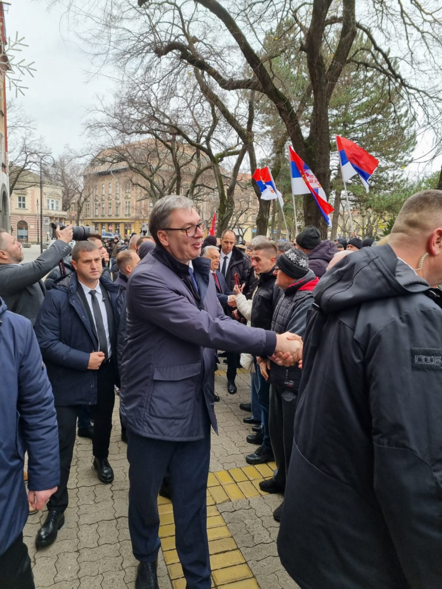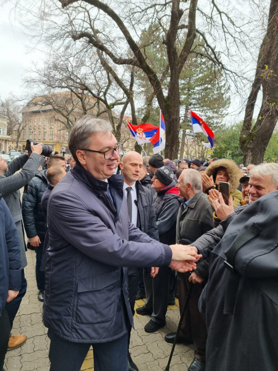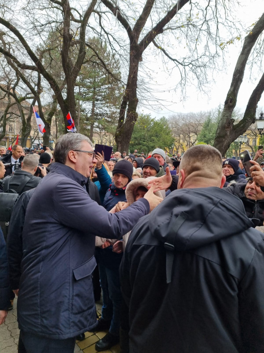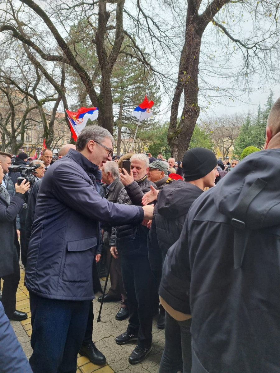 Predsednik je izdvojio vreme da im otpozdravi, rukuje se, a sa nekima i zagrli i fotografiše. Oni su skandirali "predsedniče", "živela Srbija", "živeo Vučić" i "Aco Srbine".