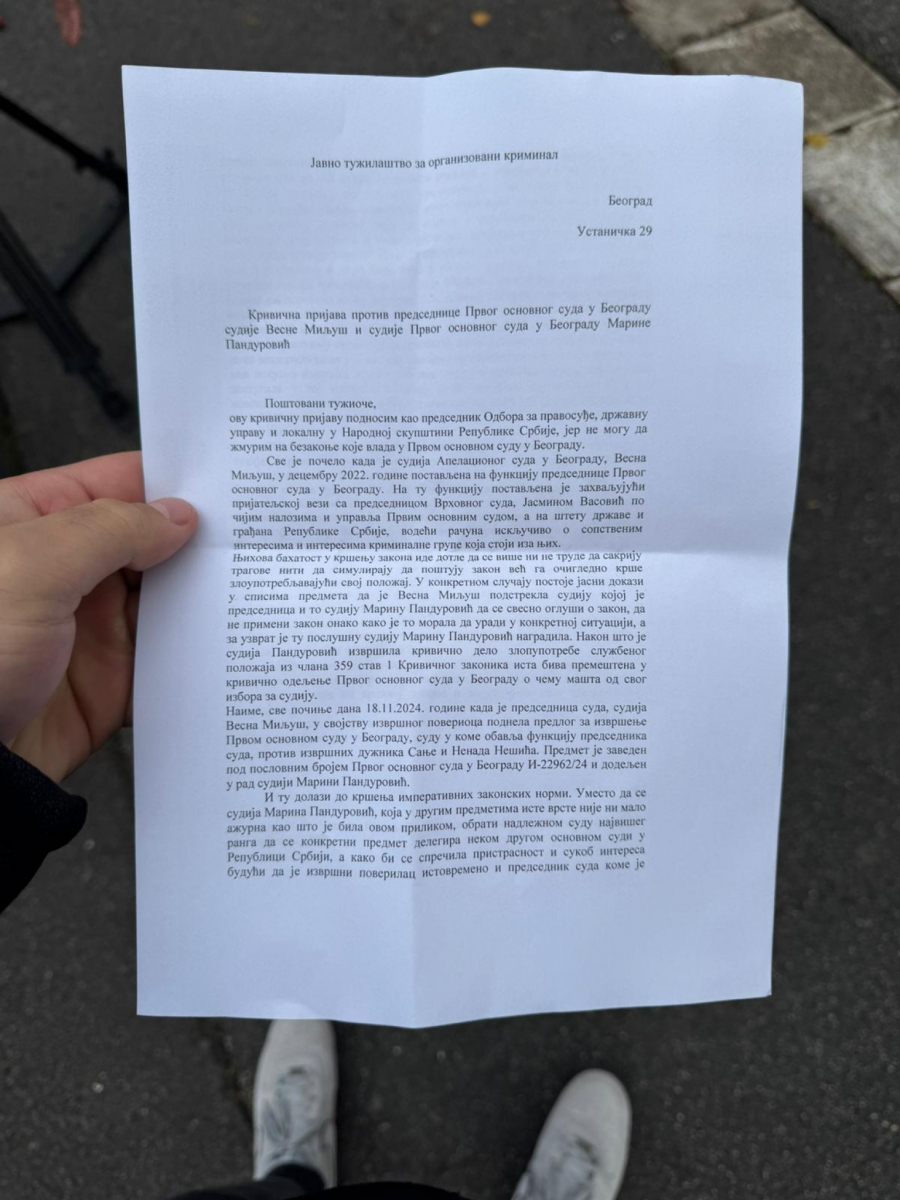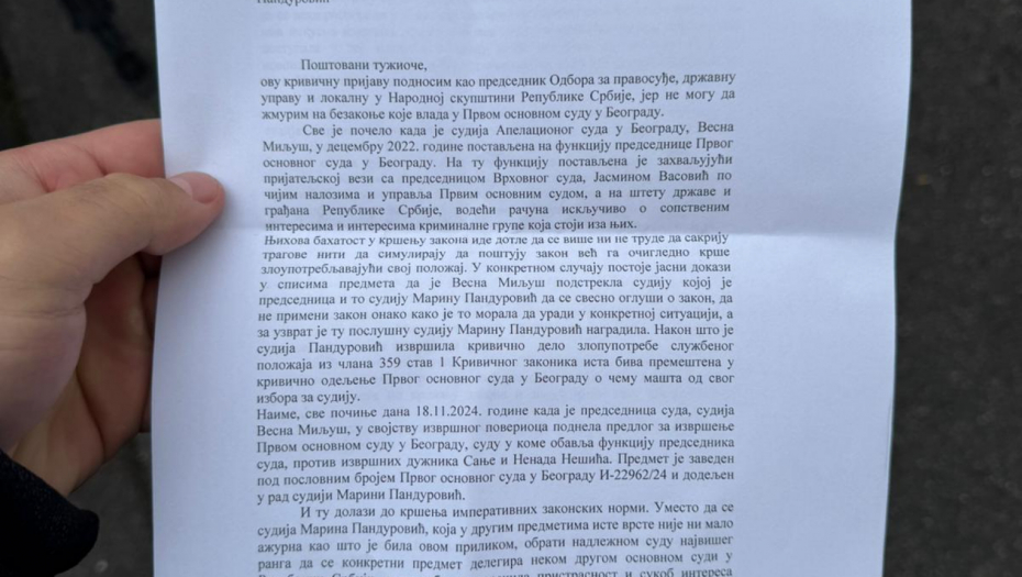 Nastavlja se moja borba za istinu i pravdu, nastavljam da se borim da se i tužilaštvo i sudstvo vrati pod kontrolu države Srbije. Kao što govorim mesecima, deo tužilaštva i sudstva se otuđio i ne poštuje Ustav i zakone. Razlog mog današnjeg dolaska u Tužilaštvo za organizovani kriminal je predavanje nove krivične prijave. Ovoga puta sam podneo krivine prijave, protiv predsednice Prvog osnovnog suda u Beogradu sudije Vesne Miljuš i sudije Prvog osnovnog suda u Beogradu sudije Marine Pandurović. Samo da vas podsetim da je Prvi osnovni sud najveći osnovni sud u Beogradu - rekao je Mrdić.