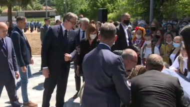 Okupljeni su pomogli devojci da ustane, a nakon što se uverio da je sa njom sve u redu, Vučić je rekao da se takve stvari dešavaju kada je napolju vruće.