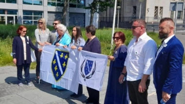 Okupilo se desetak članova muslimanskih udruženja, koji su istakli ratne zastave tzv. Armije BiH na ogradi oko improvizovanog pres centra.