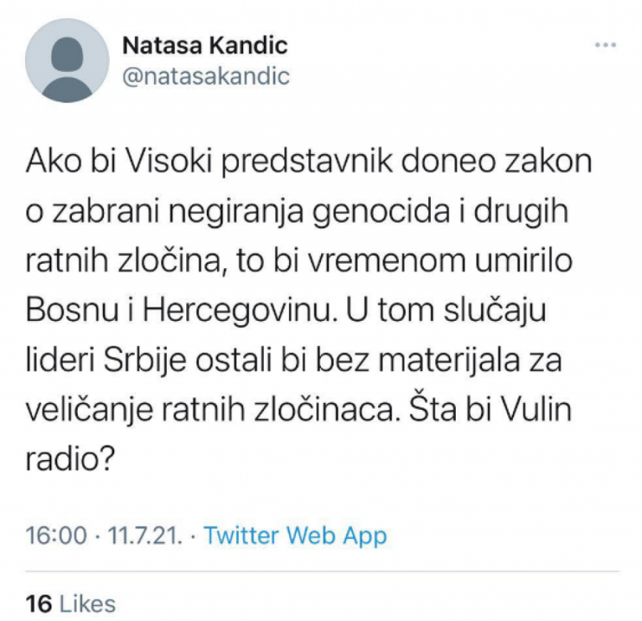 - Ako bi Visoki predstavnik doneo zakon o zabrani negiranja genocida i drugih ratnih zločina, to bi vremenom umirilo Bosnu i Hercegovinu. U tom slučaju lideri Srbije ostali bi bez materijala za veličanje ratnih zločinaca. Šta bi Vulin radio - napisala je Kandić.