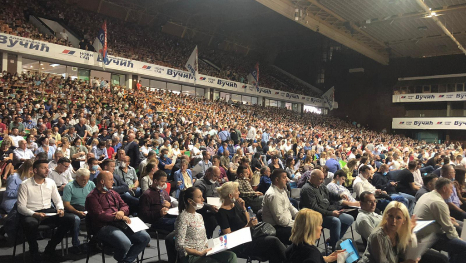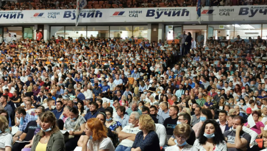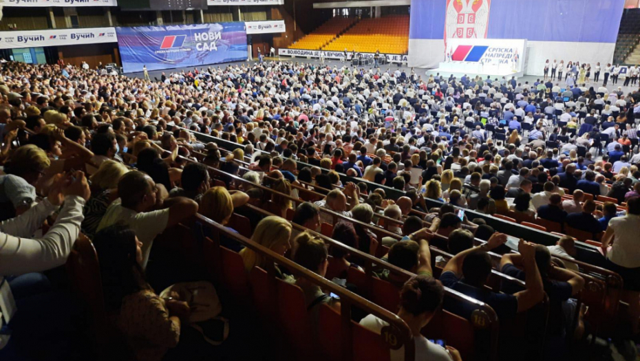 Sat vremena pred dolazak predsednika Srbije Aleksandra Vučića u halu Spens već je pristiglo na hiljade članova Srpske napredne stranke.