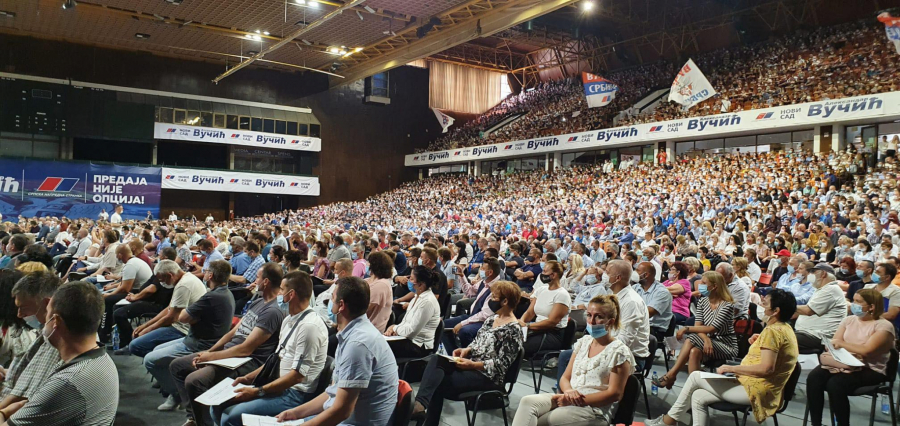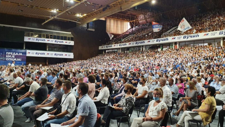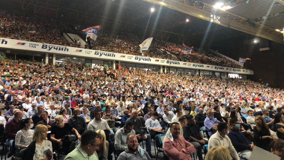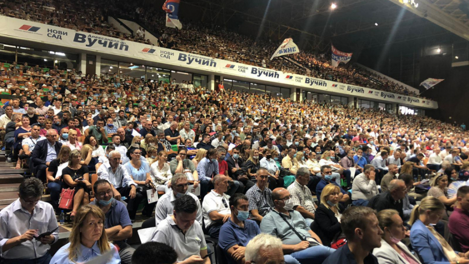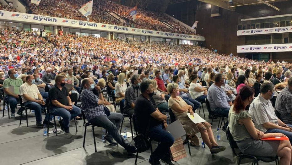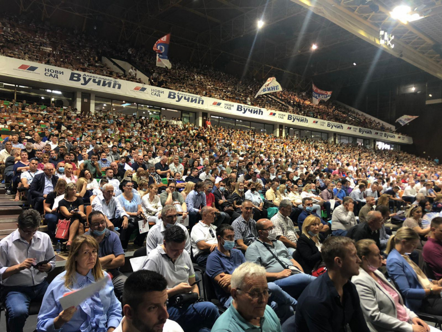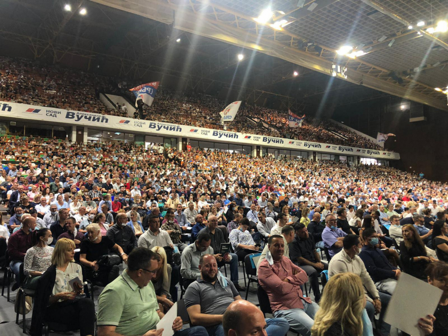 Skup koji je trajao oko dva održan je u prepunoj dvorani Spensa u prisustvu više hiljada ljudi koji su aplauzom pozdravili dolazak Vučića.