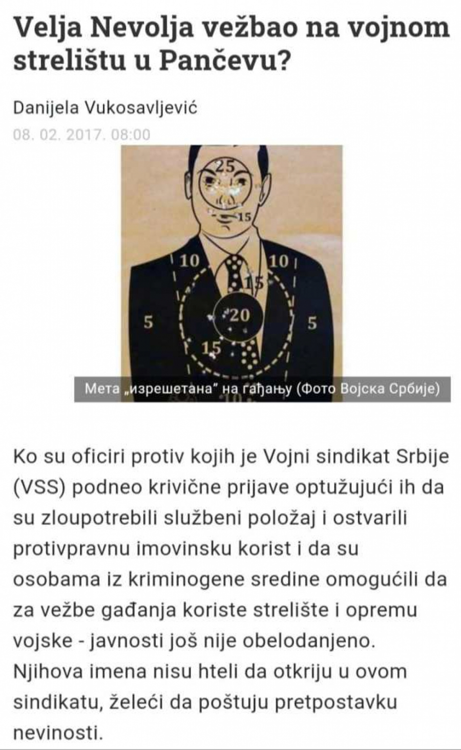 Poznato je da je klan Velje Nevolje bio stacioniran u Pančevu, u tamošnjoj vojnoj kasarni ubice Velje Nevolje vežbale su gađanje ljudskih maketa iz snajpera (!), što se inače radi kada se planira atentat na neku visoku državnu ličnost, a kasnije su se preselili na periferiju Pančeva u Banatski Brestovac, gde su nastavili da vežbaju gađanje iz bojevog oružja.