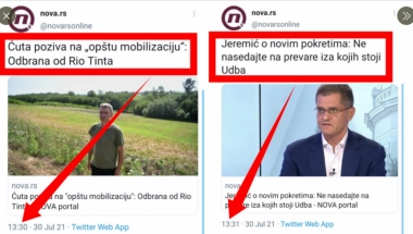 Na Tviter profilu ovog medija osvanula je vest u kojoj navodni ekološki aktivista Aleksandar Jovanović Ćuta poziva na narodni bunt protiv Rio Tinta.