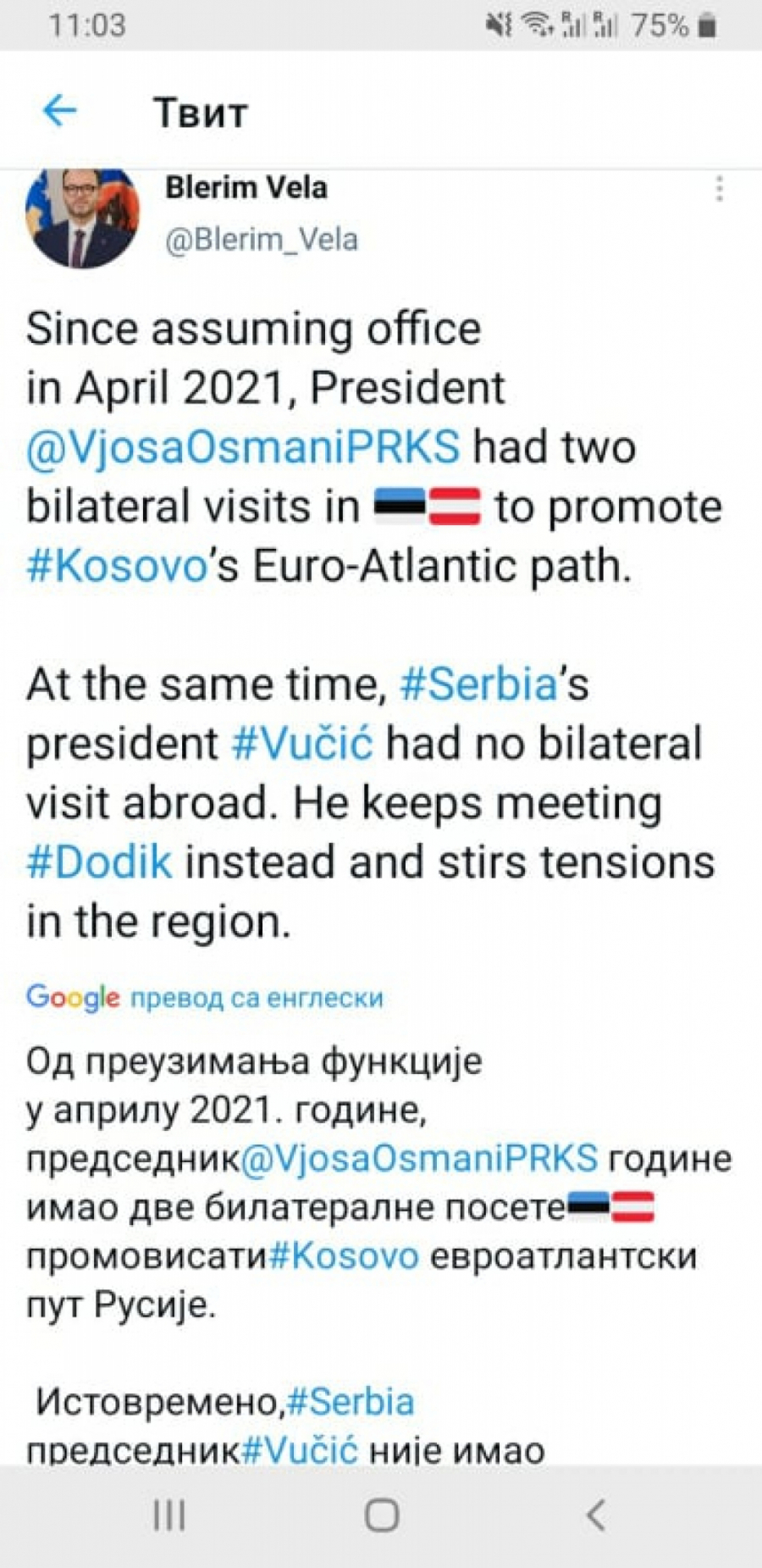 Naime, Bljerim Velja je naveo da je njegova šefica Osmanijeva od početka svog mandata u aprilu ove godine obavila već dve bilateralne posete ne bi li radila na napredovanju lažne države Kosovo duž evro-atlantskog puta.