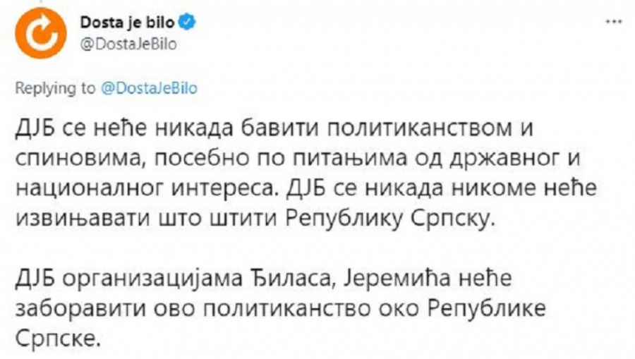 "DJB se neće nikada baviti politikanstvom i spinovima, posebno po pitanjima od državnog i nacionalnog interesa. DJB se nikada nikome neće izvinjavati što štiti Republiku Srpsku.