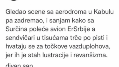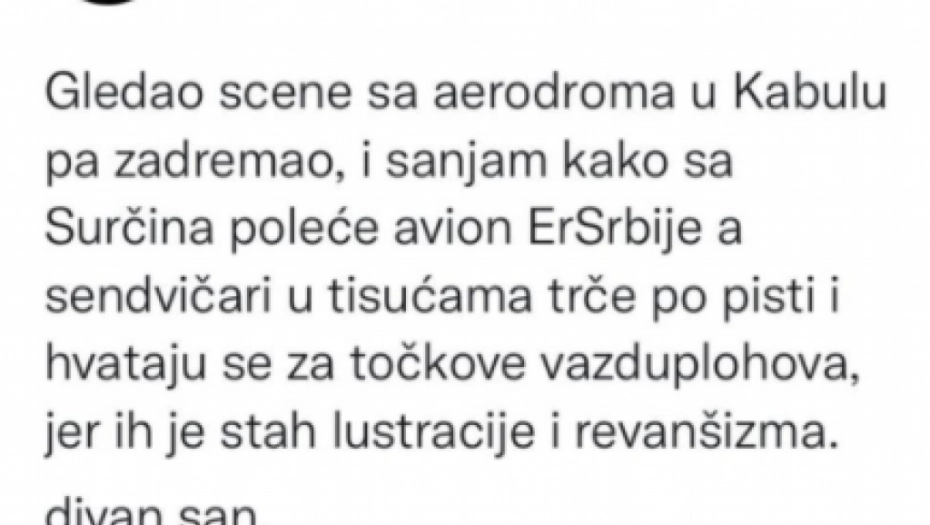 "Gledao scene sa aerodroma u Kabulu pa zadremao i sanjam kako se Surčina poleće avion Er Srbije, a sendvičari u tisućama trče po pisti i hvataju se za točkove vazduhoplova, jer ih je strah lustracije i revanšizma, divan san", kaže ovaj junak.