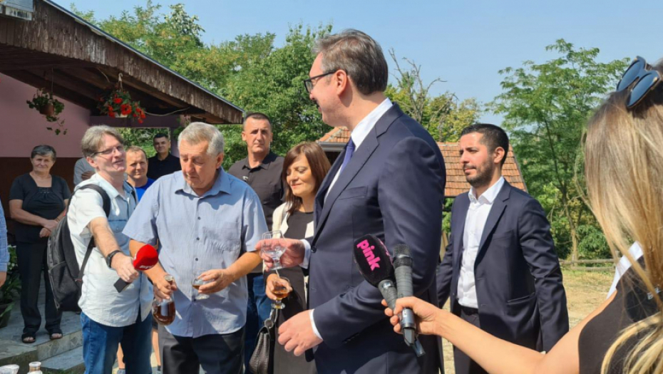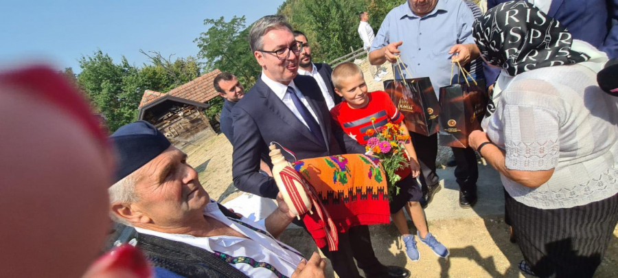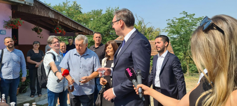 Predsednik Vučić i ministar poljoprivrede Branislav Nedimović u dvorištu porodice Blagojević, obišli su i izložene domaće proizvode, među kojima najviše med i rakiju, koje su proizveli lokalni proizvođači, ali i odevne predmete od pamuka i vune koje su ručno izradile žene članice Udruženja "Carske orhideje" iz Bajine Bašte.