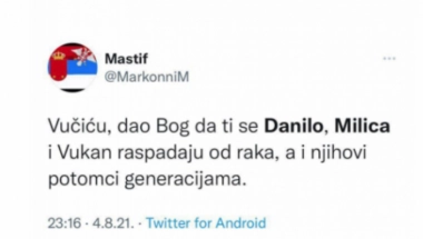 - Vučiću, dao Bog da ti se Danilo, Milica i Vukan raspadaju od raka, a i njihovi potomci generacijama - napisao je Tviter vitez skrven za imena Mastif.