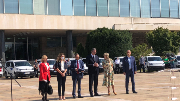 Predsednik Aleksandar Vučić prisustvuje primopredaji 26 specijalizovanih vozila za prevoz vakcina i medicinskog osoblja.