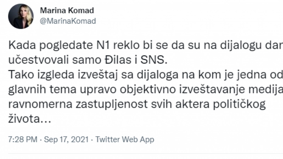 "Kada pogledate N1 reklo bi se da su na dijalogu danas učestvovali samo Đilas i SNS. Tako izgleda izveštaj sa dijaloga na kom je jedna od glavnih tema upravo objektivno izveštavanje medija i ravnomerna zastupljenost svih aktera političkog života..."