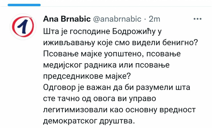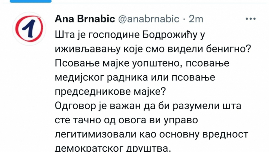 Šta je gospodine Bodrožiću u iživljavanju koje smo videli benigno? Psovanje majke uopšteno, psovanje medijskog radnika ili psovanje predsednikove majke? Odgovor je važan da bi razumeli šta ste tačno od ovoga vi upravo legitimizovali kao osnovnu vrednost demokratskog društva", upitala je Brnabić.