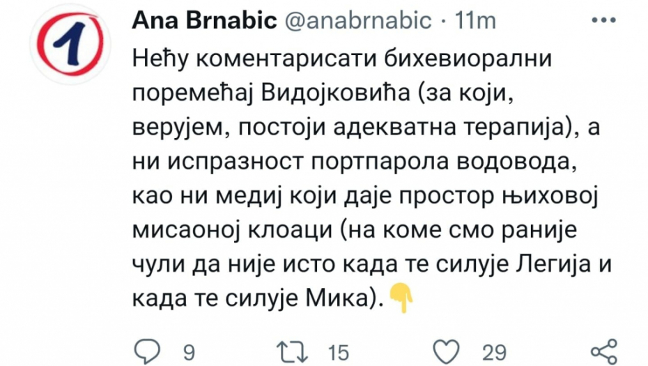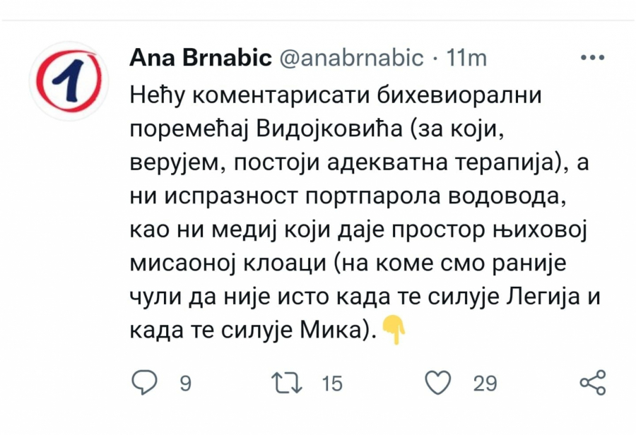 "Neću komentarisati bihevioralni poremećaj Vidojkovića (za koji, verujem, postoji adekvatna terapija), a ni ispraznost portparola vodovoda, kao ni medij koji daje prostor njihovoj misaonoj kloaci (na kome smo ranije čuli da nije isto kada te siluje Legija i kada te siluje Mika).