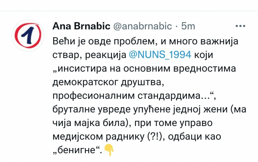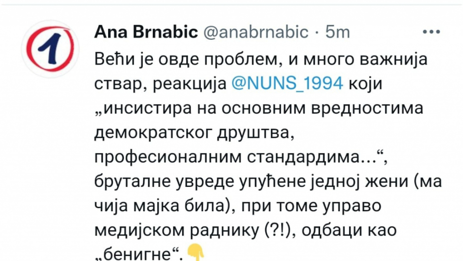 Veći je ovde problem, i mnogo važnija stvar, reakcija NUNS-a koji "insistira na osnovnim vrednostima demokratskog društva, profesionalnim standardima...", brutalne uvrede upućene jednoj ženi (ma čija majka bila), pri tome upravo medijskom radniku (?!), odbaci kao "benigne".