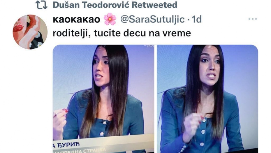 Tako je na društvenoj mreži Tviter koja služi kao rame za plakanje građanerima, krugodvojkašima i drugosrbijancima, osvanuo natpis "Roditelji, tucite decu na vreme" ispod koga je objavljena fotografije Nevene Đurić.