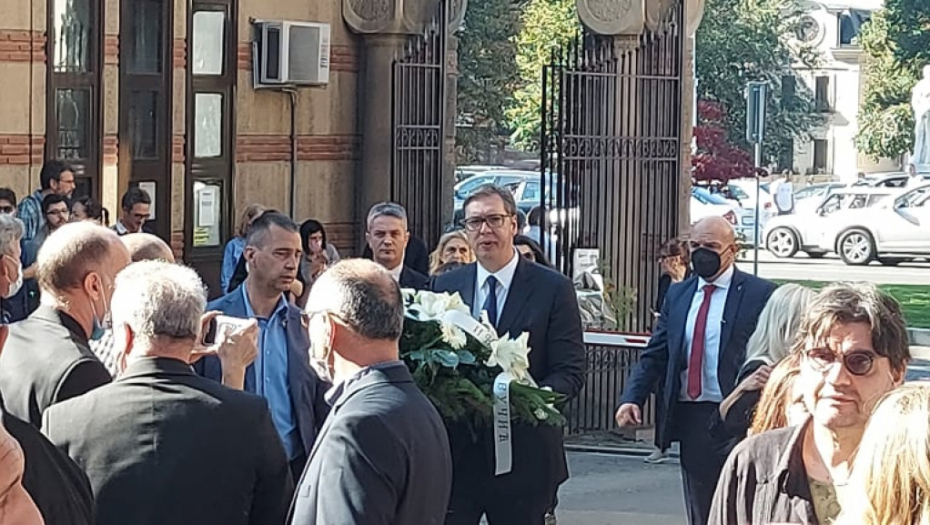 Predsednik Vučić je ušao u crkvu i predao porodici buket belih gerbera, a zatim izjavio saučešće prisutnima.