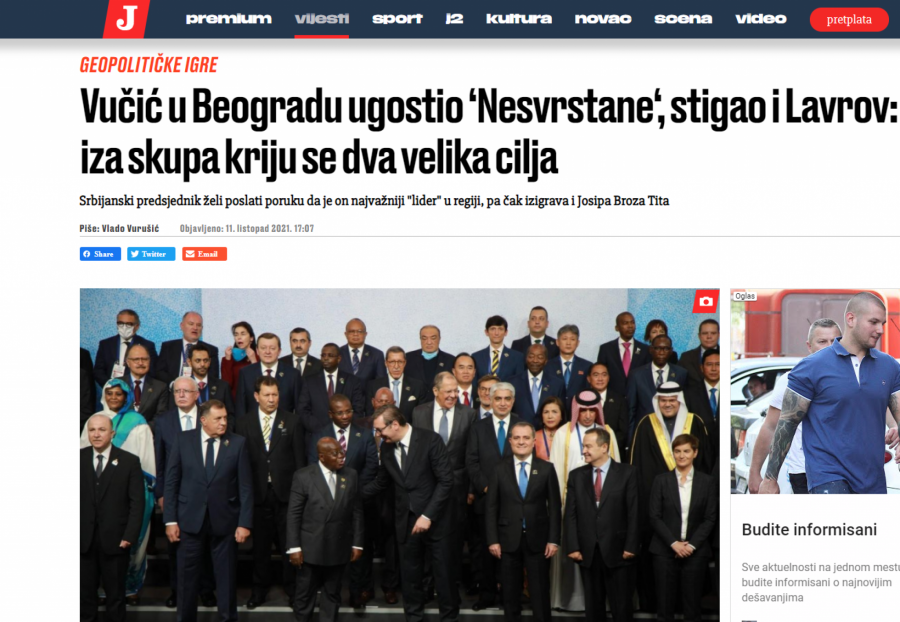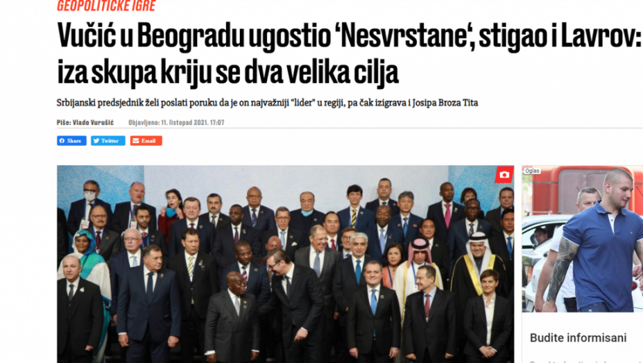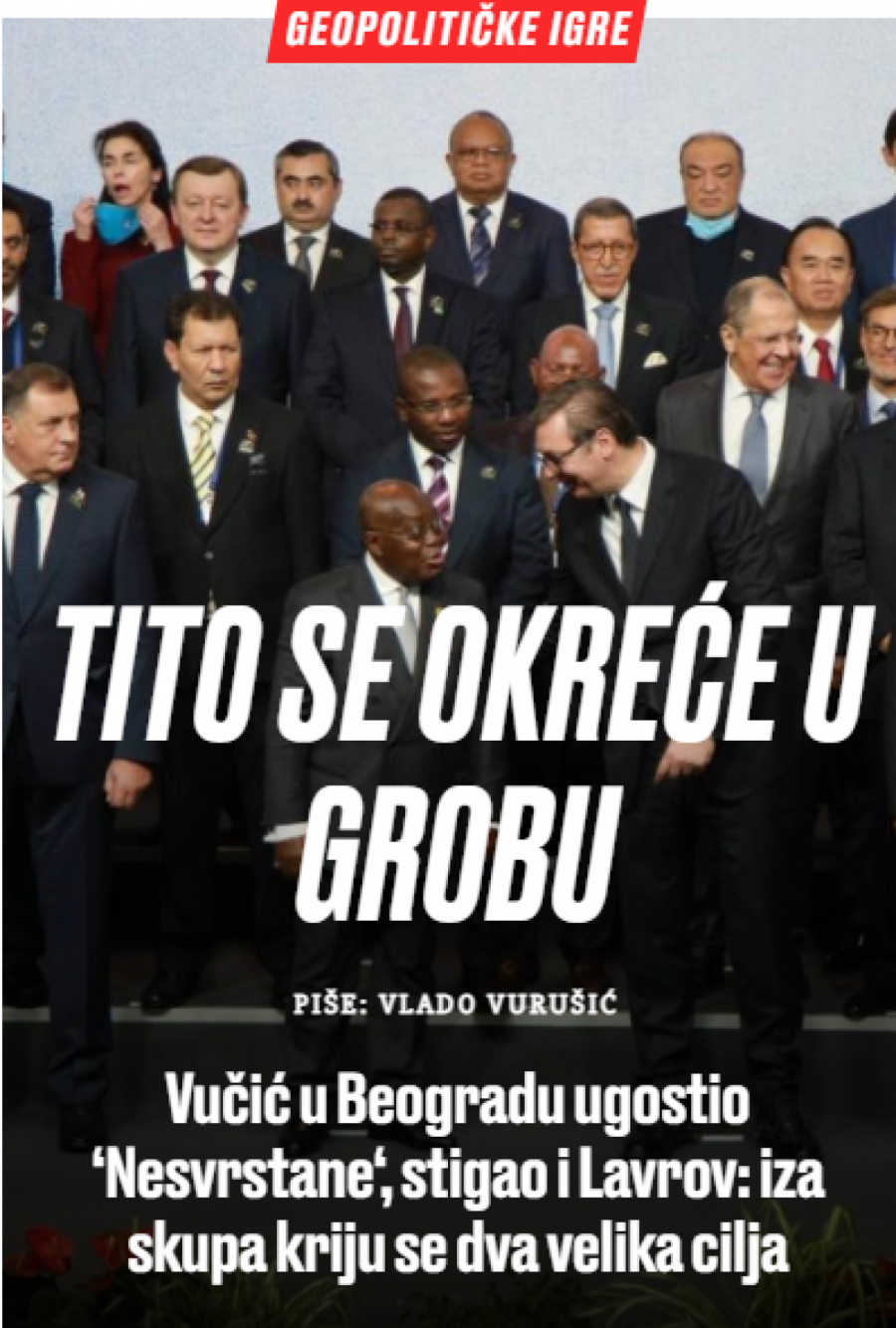 Naime, na hrvatskom sajtu Jutarnji.hr osvanuo je članak sa naslovom "TITO SE OKREĆE U GROBU Vučić u Beogradu ugostio "Nesvrstane", stigao i Lavrov: Iza skupa kriju se dva velika cilja".