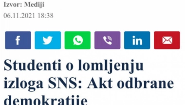 Studenti koji su razbili izlog na prostorijama Srpske napredne stranke (SNS) u novosadskom naselju Detelinara, Srđan Đurić i Mladen Cvijetić, saopštili su da je to bio "akt odbrane demokratije" jer, kao mladi, ne žele da učestvuju u ponavljanju grešaka iz prošlosti, pošto "za neprijatelje demokratije nema demokratije".