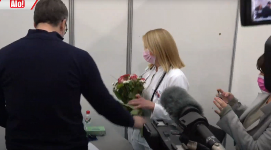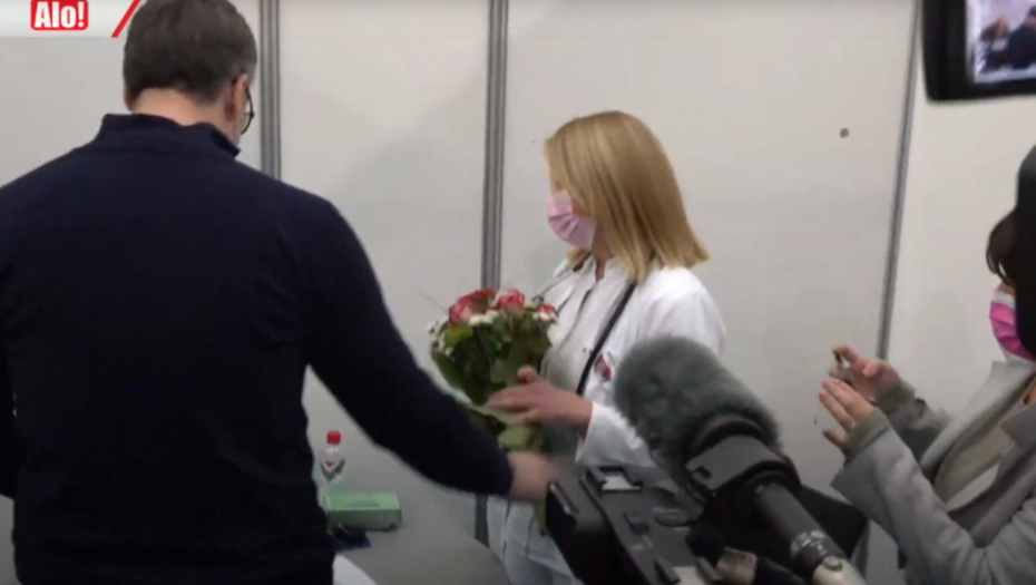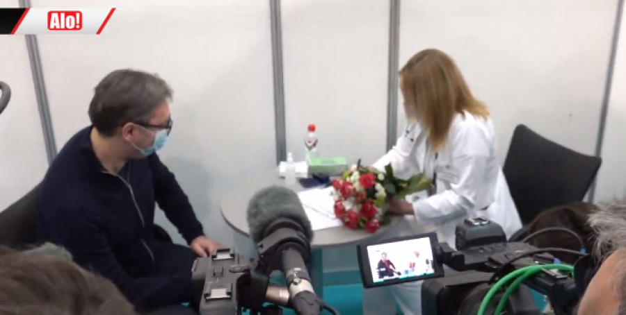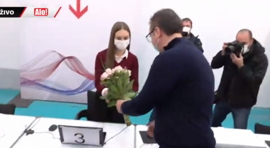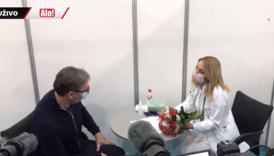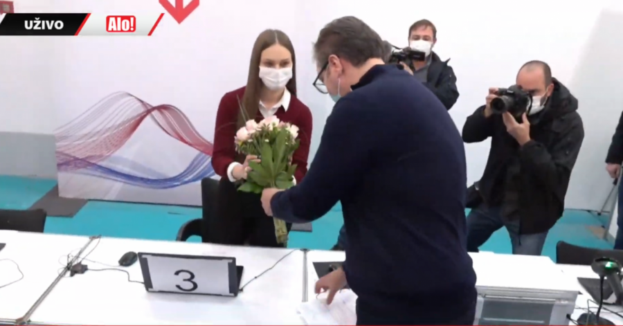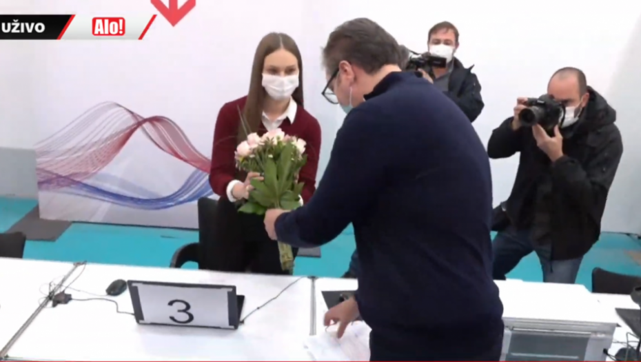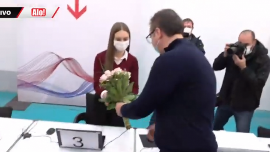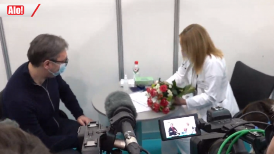Dok je davao lične podatke, predsednik se raspitivao o tome da li zaposlenima na punktu za vakcinaciju nešto nedostaje. Tada je Vučić iznenadio osoblje, te je medicinskim sestrama podelio po buket cveća.