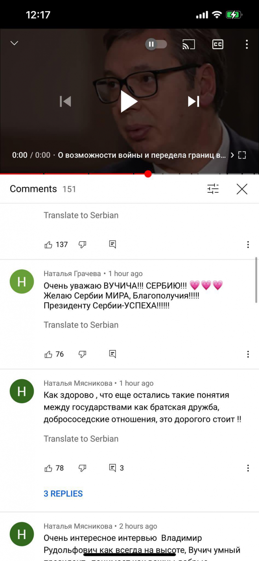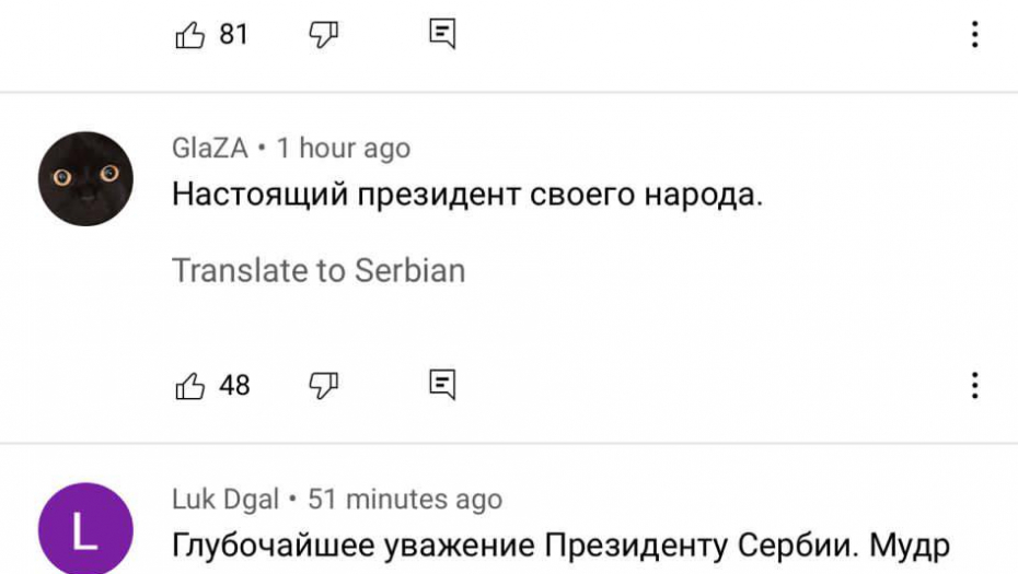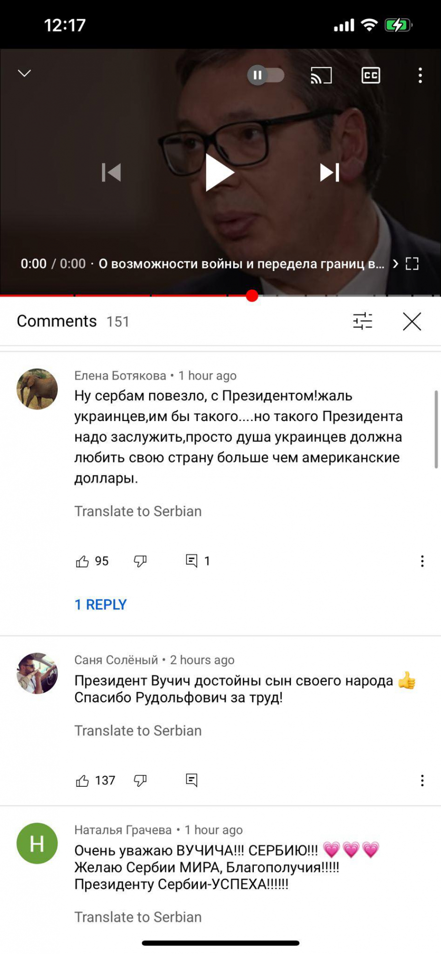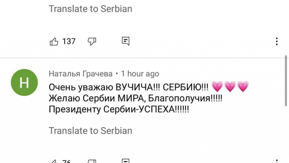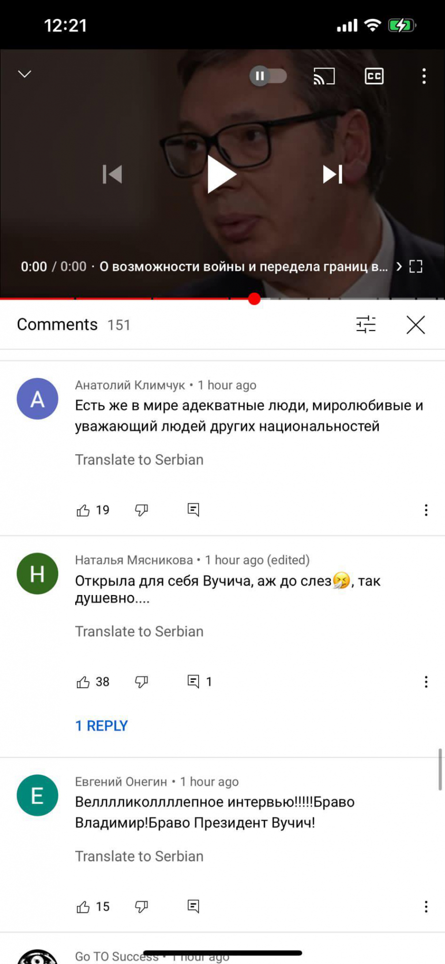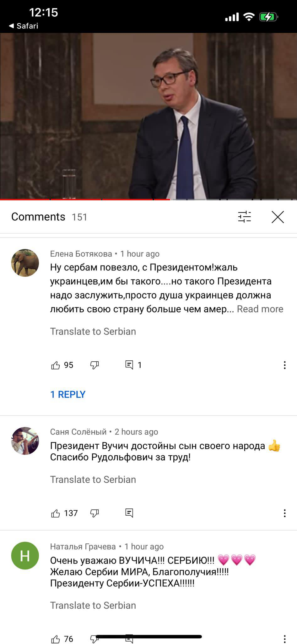 Gledam intervju sa suzama u ocima”, “Pravi predsednik dostojan svog naroda”, “Iskren i dobar covek”, samo su neki od komentara koji svedoče kako su Rusi pokazali izuzetno poštovanje prema predsedniku Vučiću i srpskom narodu.
