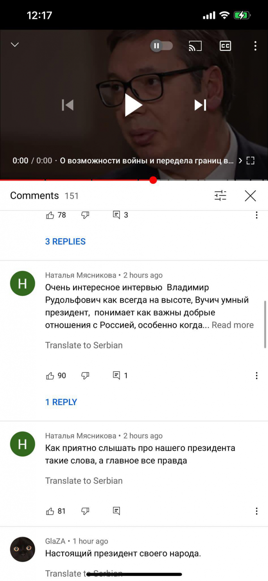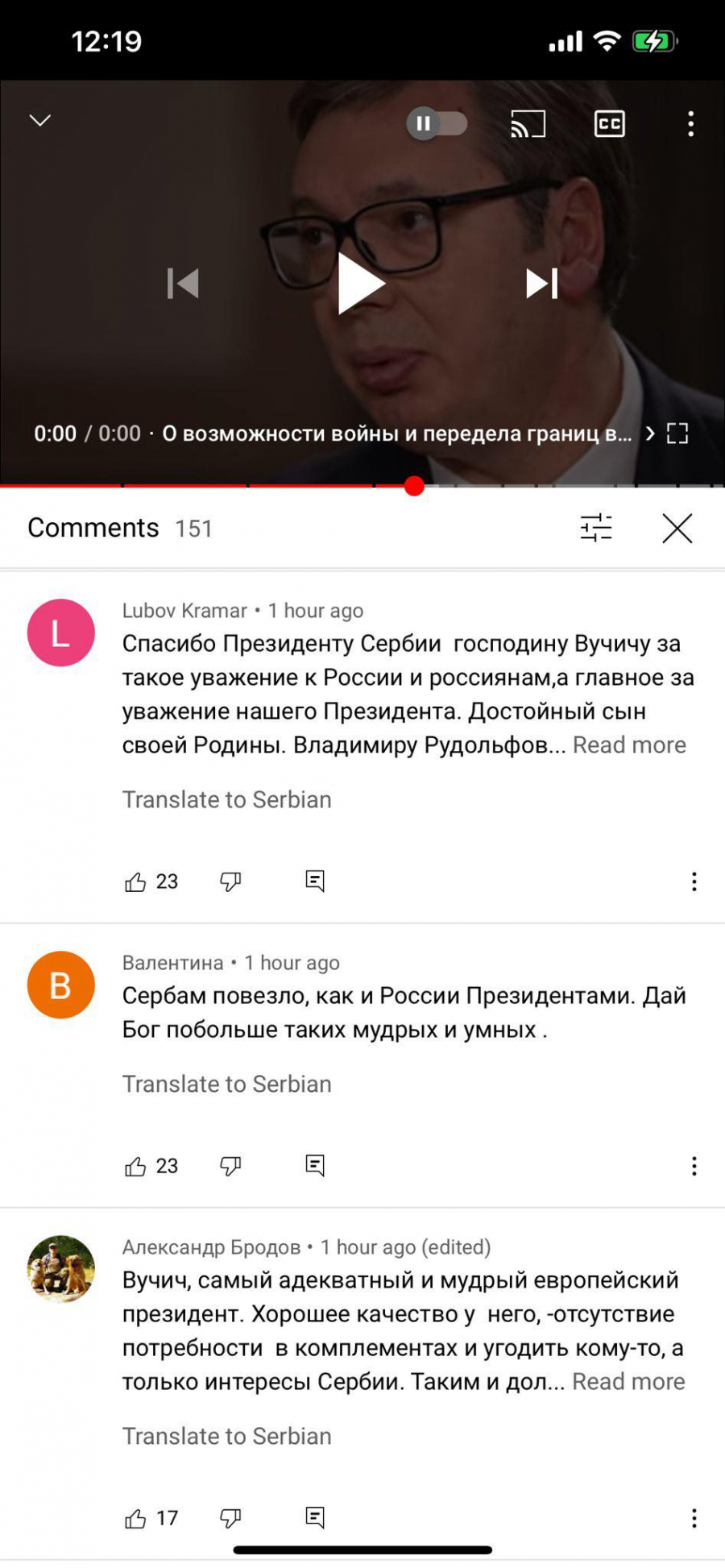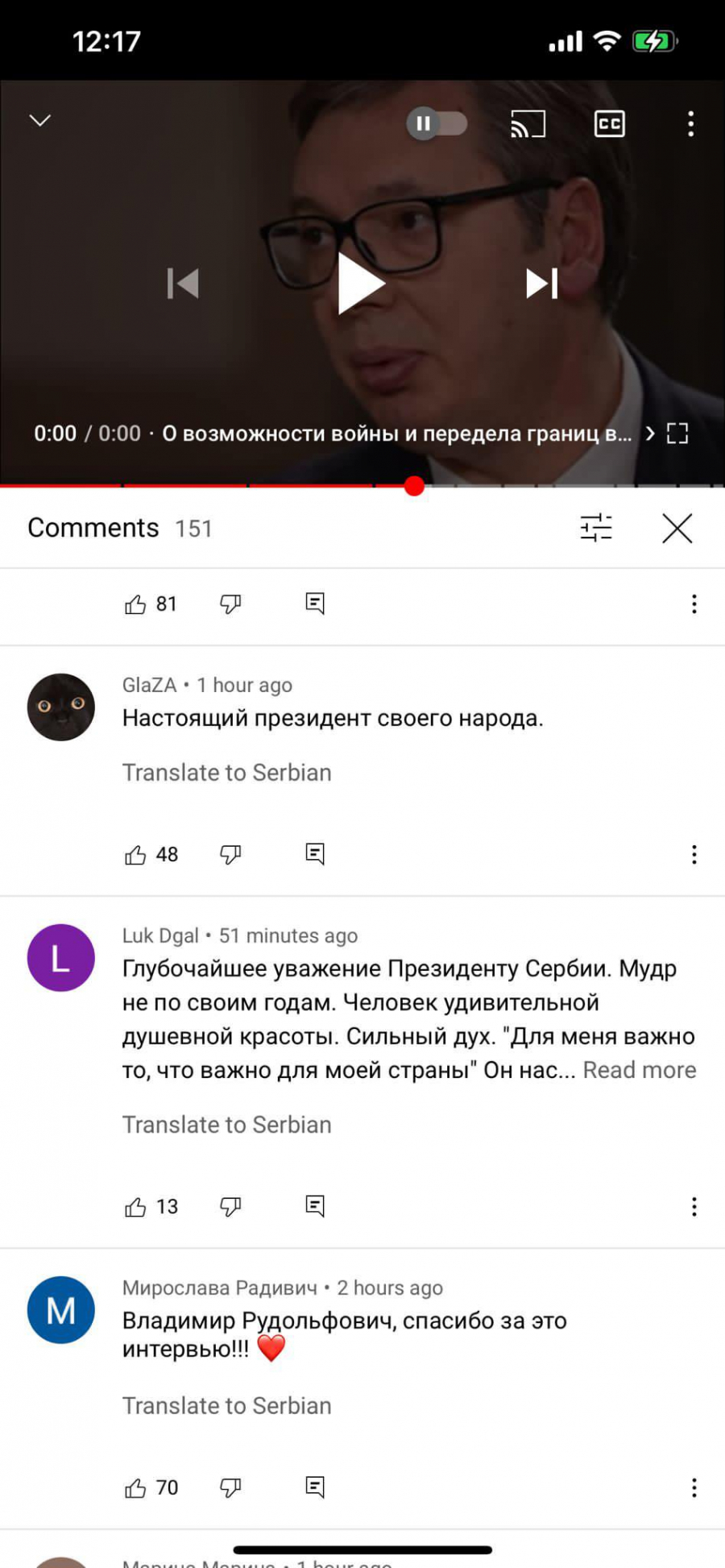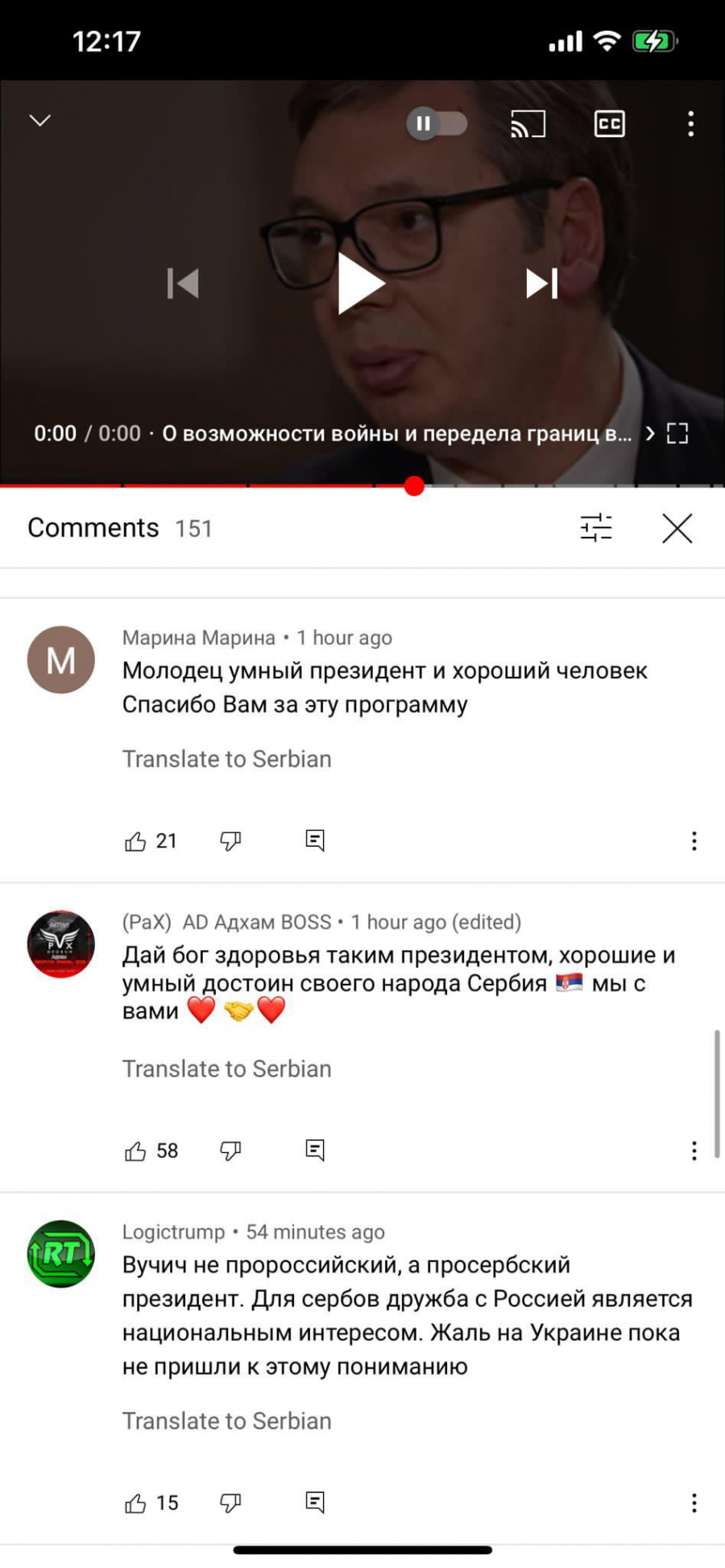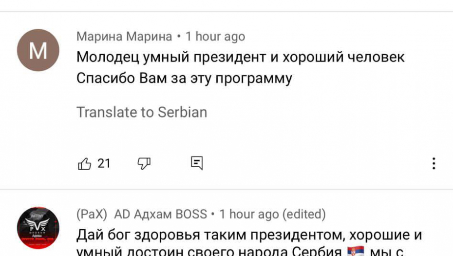 Gledam intervju sa suzama u ocima”, “Pravi predsednik dostojan svog naroda”, “Iskren i dobar covek”, samo su neki od komentara koji svedoče kako su Rusi pokazali izuzetno poštovanje prema predsedniku Vučiću i srpskom narodu.
