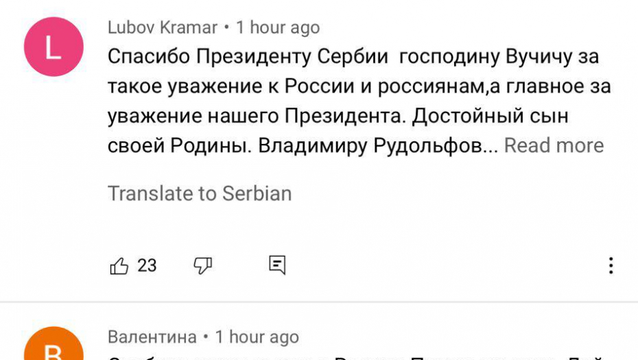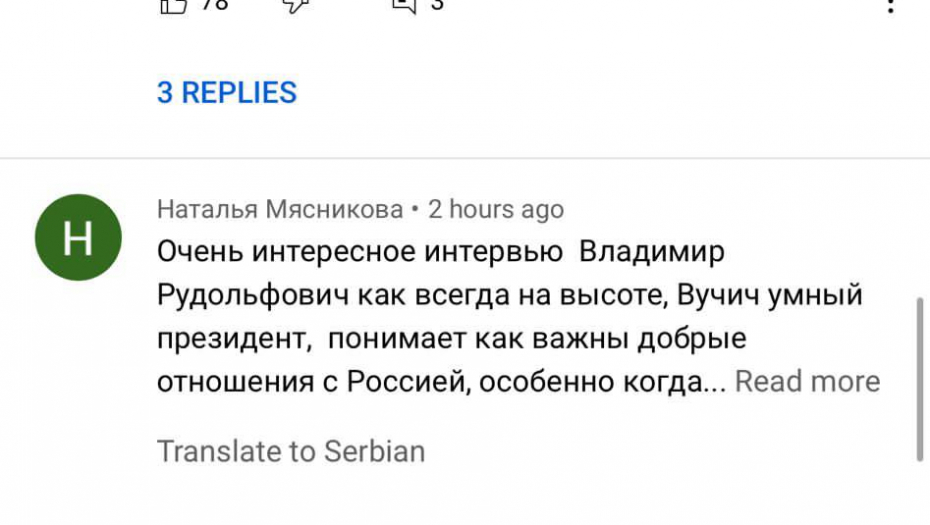 - Veoma interesantan intervju Vladimire Rudolfoviću, kao i uvek na vrhu, Vučić je pametan predsednik, razume koliko su važni dobri odnosi sa Rusijom, posebno kada su iskreni