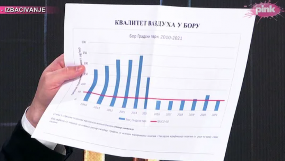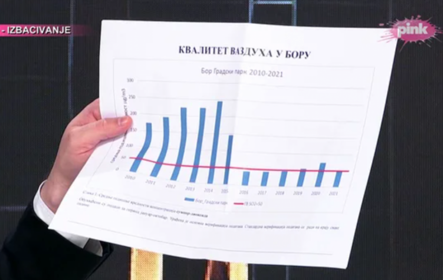 Vučić je pokazao podatke o zagađenju u Boru, koji jasno pokazuju da je vazduh u tom gradu mnogo čistiji i zdraviji. Rekao je i da je spreman da ide u Krivalj, i u Bor, da priča sa ljudima koje hoće da isele.