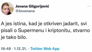 "A jes istina, kad je otkriven jadarit, svi pisali o Supermenu i kriptonitu, stvarno je tako bilo", potvrdila je ona u svojoj tviter objavi.