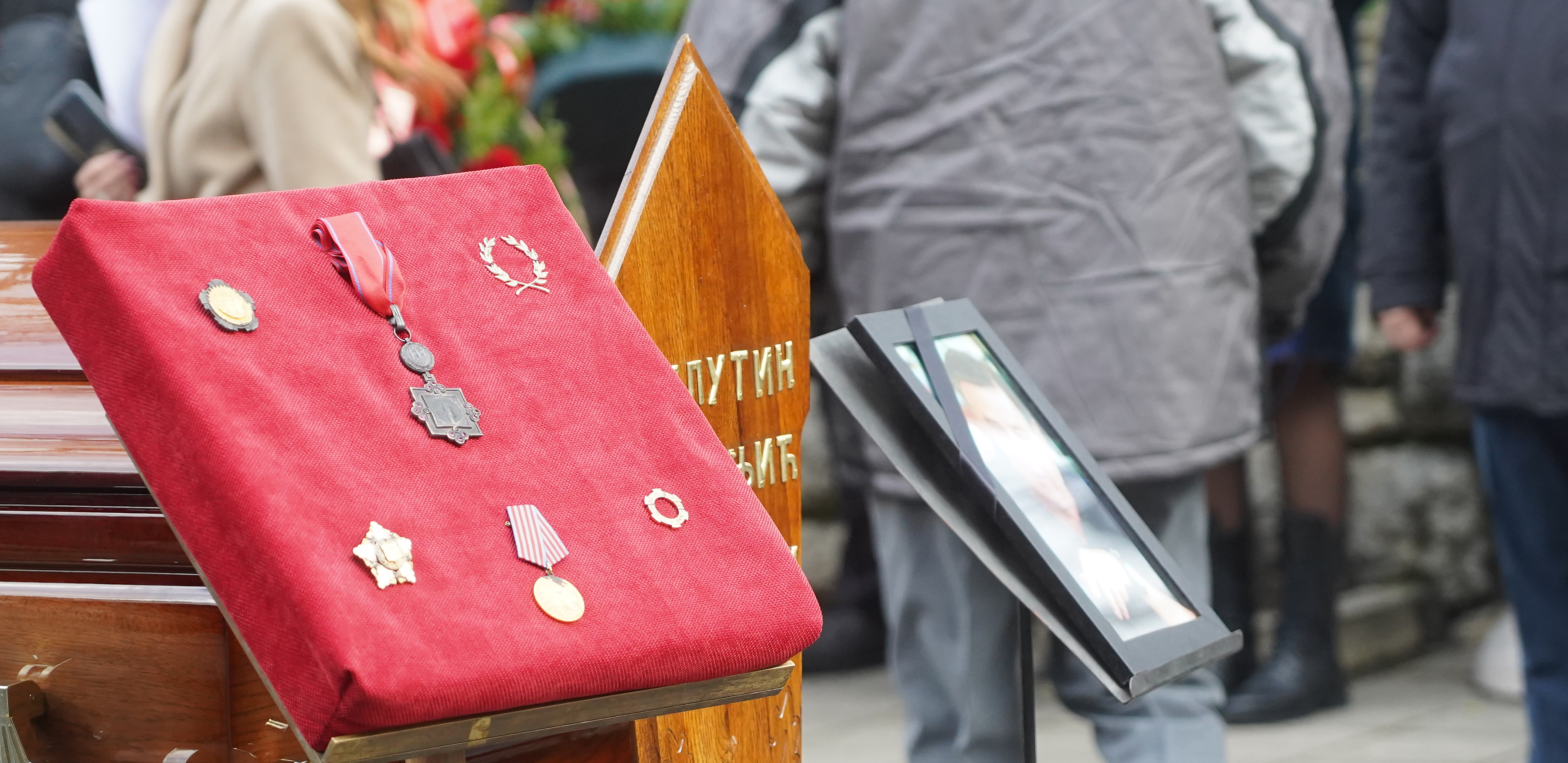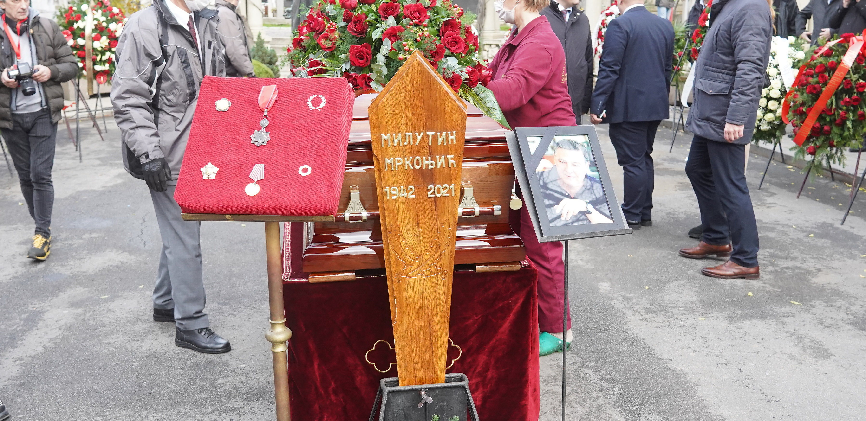 Ispred kovčega na odru stoje i brojni venci i ordenje, Titovo i Slobodana Miloševića, na koje je Mrkonjić bio izuzetno ponosan i sa kojim je želeo da ga sahrane.