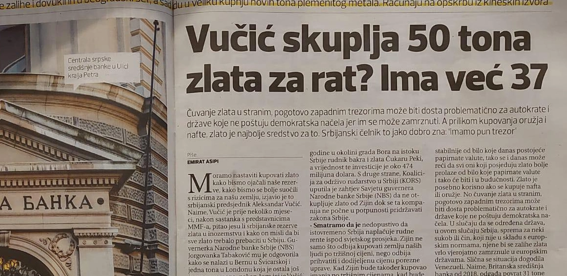 U ovom sramnom tekstu piše kako Srbija uz pomoć Kineza gomila zlato, koje dobija po najpovoljnijoj ceni, i čeka magičnu cifru od 50 tona kako bi bila spremna za rat.