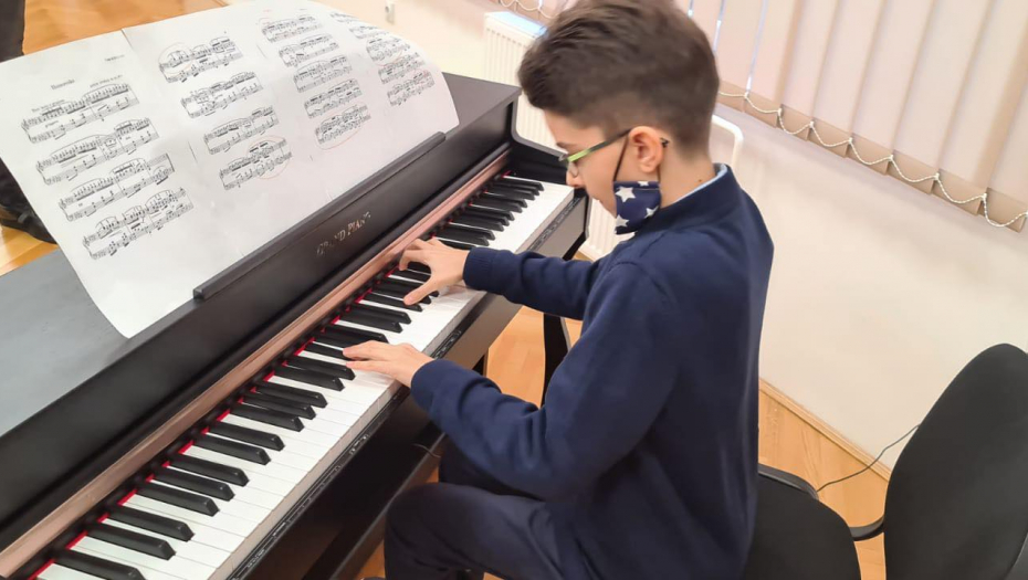 Okružen kjigama dečak uvežbava sviranje kompozicije, čijem sviranju će prisustvovati predsednik Srbije.