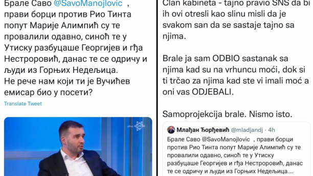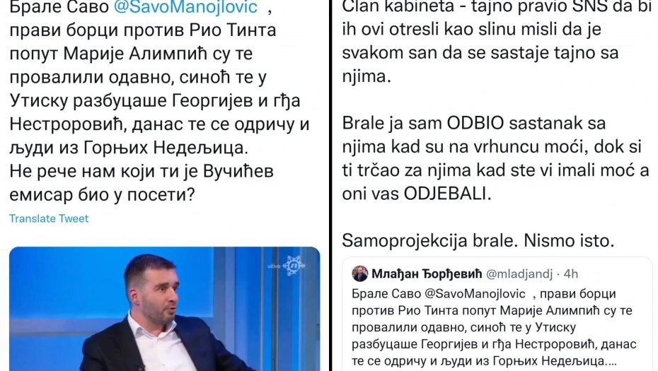Puca na sve strane među lažnim ekolozima. Savo Manojlović i Mlađan Đorđević su "zaratili" na Tviteru, a uvreda uvredu stiže. Očigledno je da su posle kraha protesta i blokada i ubedljive pobede "Da" na referendumu u panici obojica jer ne znaju na koju će stranu...