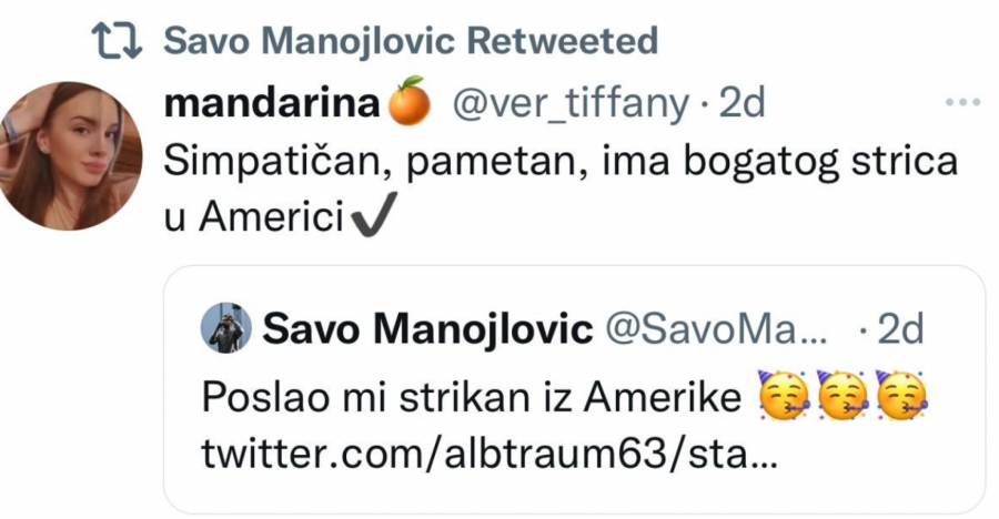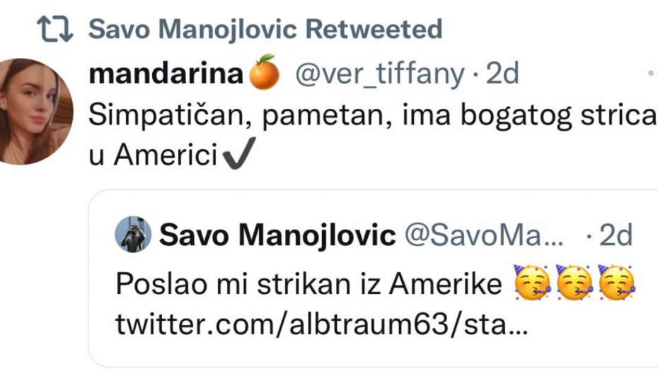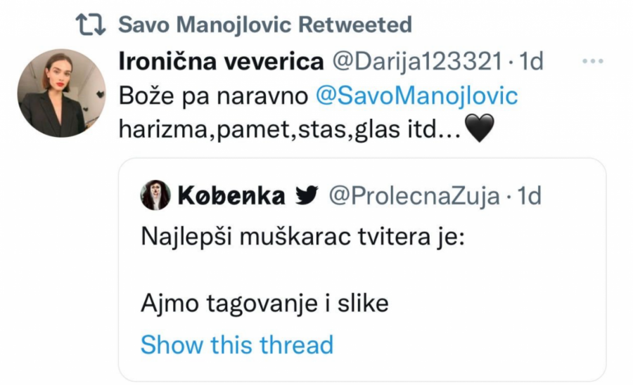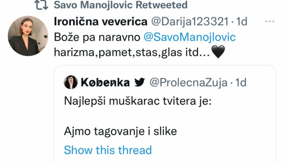 Za samo dva dana Manojlović se dopisivao sa velikim brojem žena, a izvlači se zaključak da je očigledno narcisoidna ličnost jer je retvitovao sve tvitove u kojima ga hvale i govore da je lep.