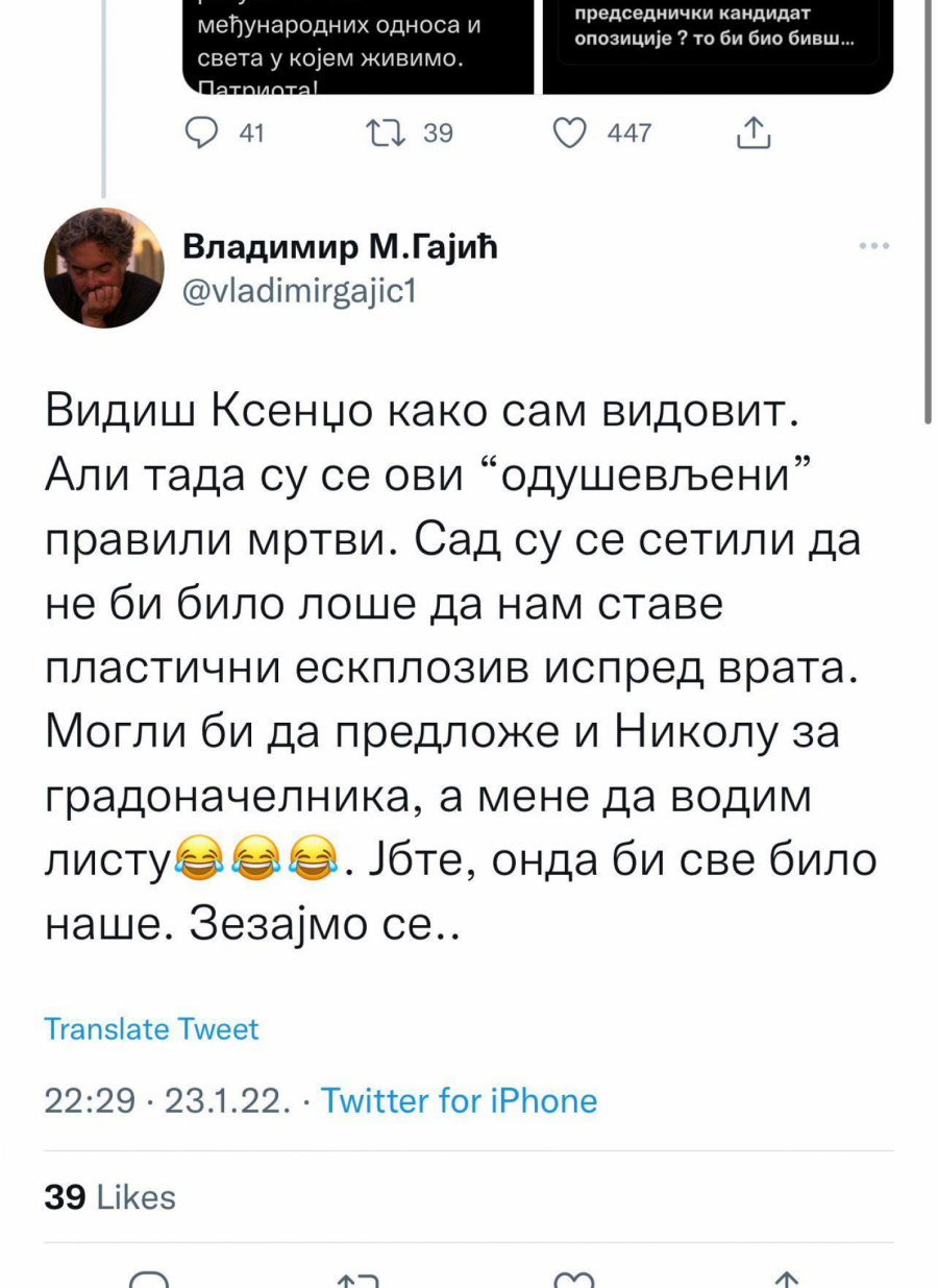 Gajić je odgovorio na tvit u kome se pominje njegov raniji predlog da se Zdravko Ponoš izabere kao kandidat opozicije na sledećim predsedničkim izborima.